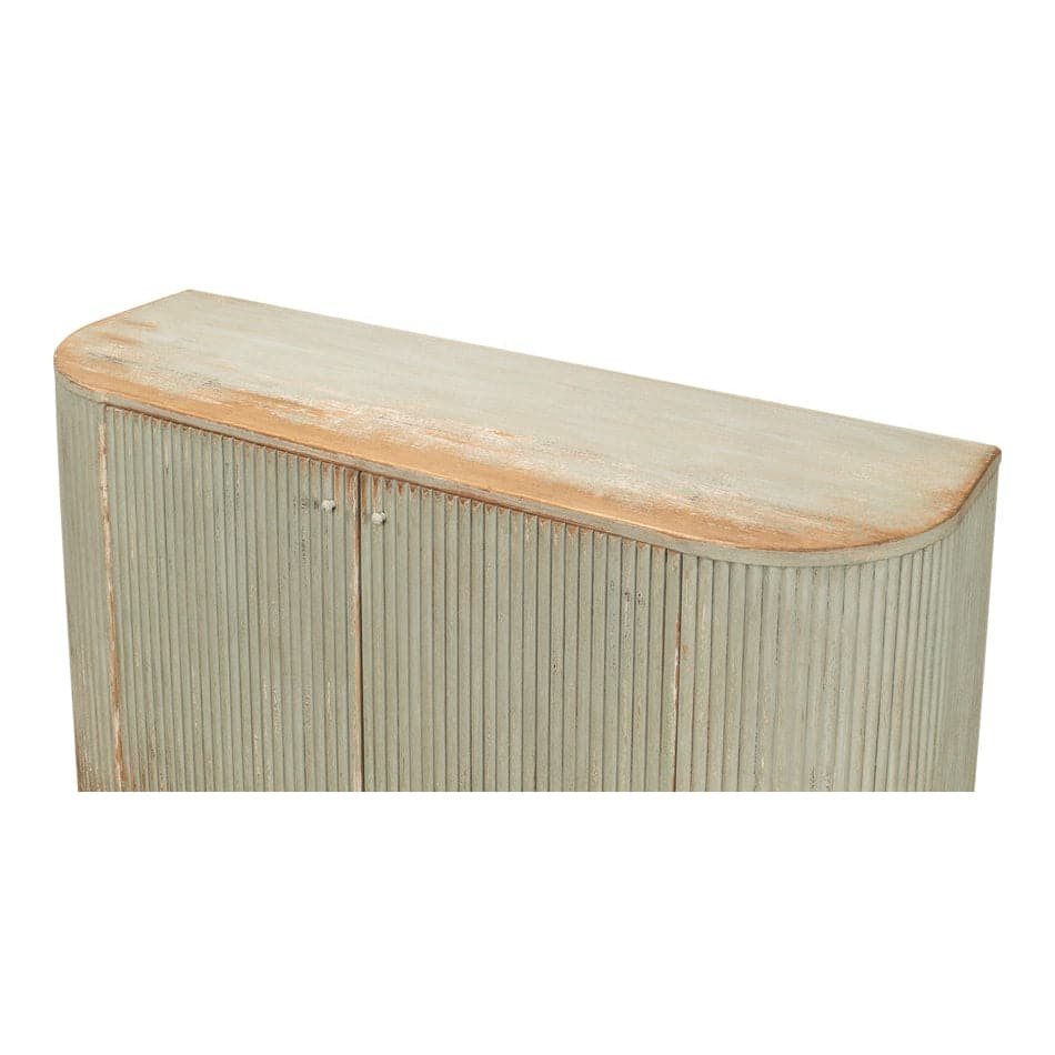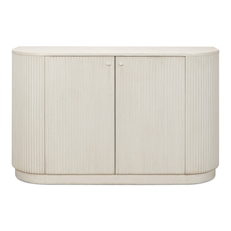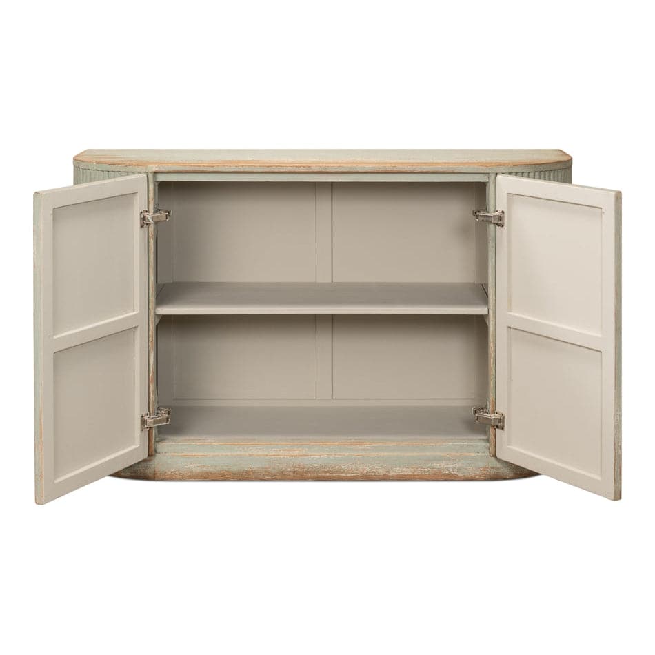 A true diva in the making, this pine demilune brings drama to any space she calls home.Textural, ribbed exterior details conceal two large doors and a shelf for a surprising amount of storage as well as style. Finished in white or sage.