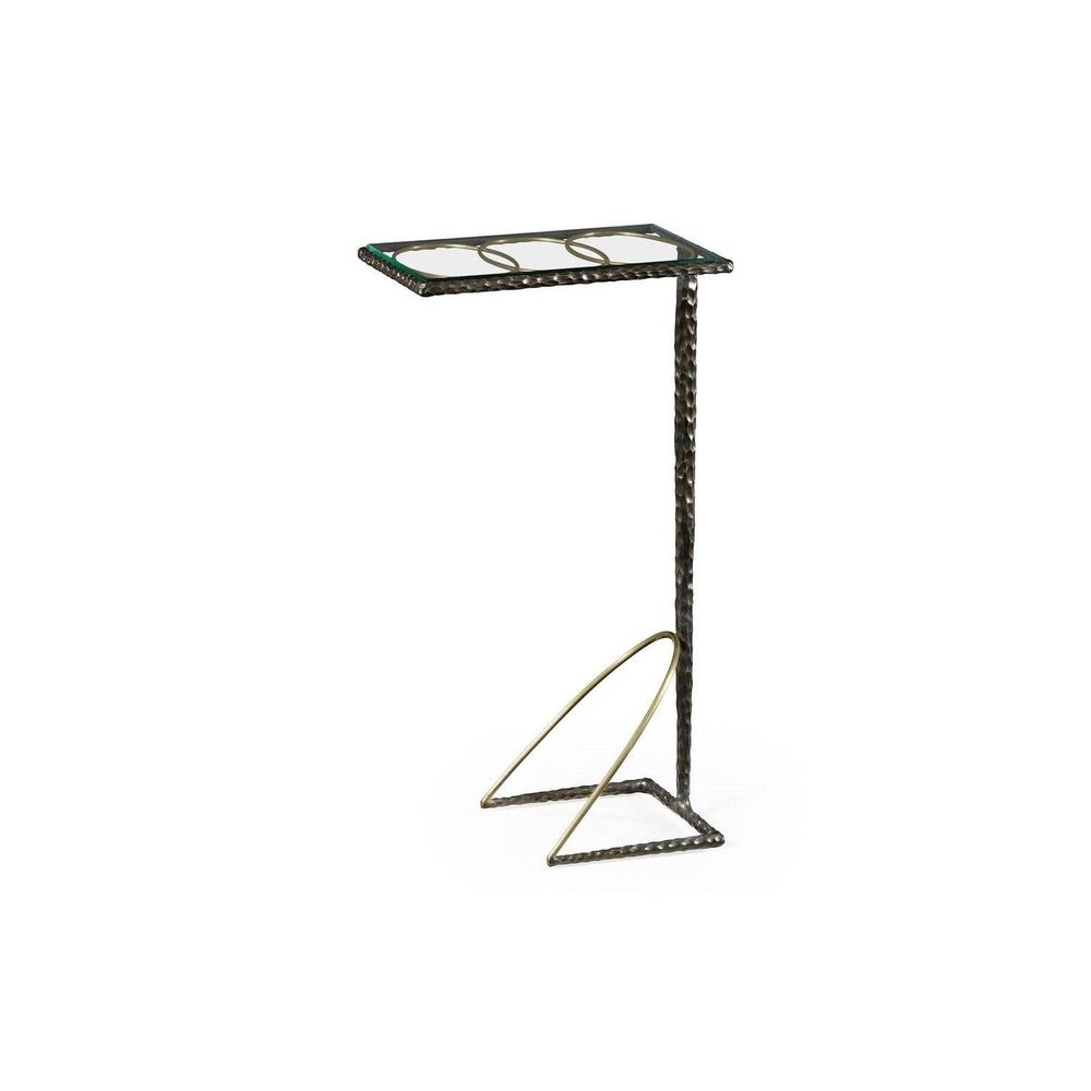 Unusual hammered and antique black brass finished sofa drinks table which fits around the arm of the furniture, with an inset glass top and oval ring support. Inspired by Italian designs of the 1940s.