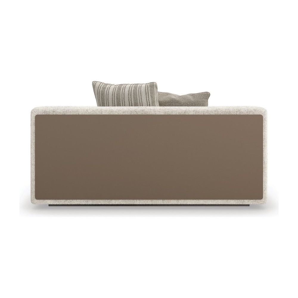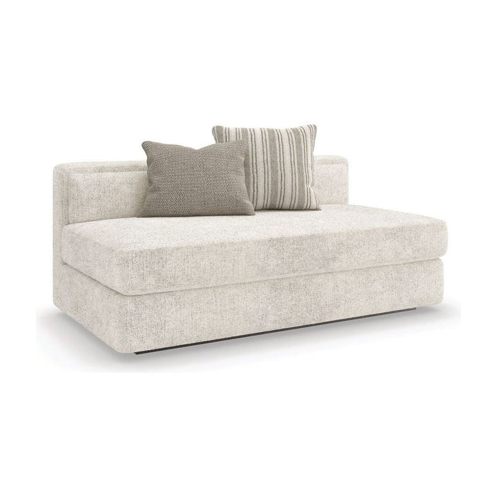 A holistic expression of design integrity, the Unity sectional mixes singular elements: organic tones, contrast, and texture to create a sense of harmony. Clean lines call to mind a modern European style, dressed in a creamy tactile fabric with a contrasting leather panel outback. Introduces a low, lounge-like aesthetic with lumbar cushioning along the back and feather-down toss pillows for added comfort and layering.