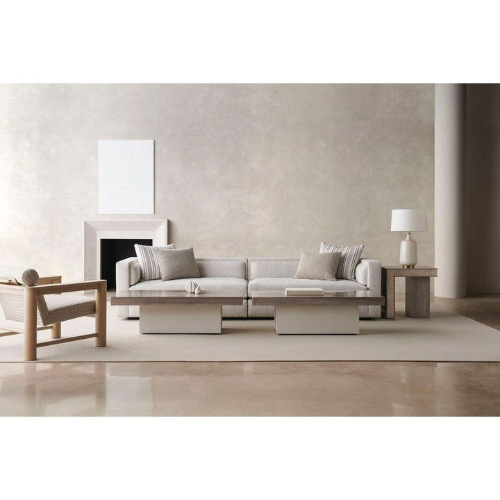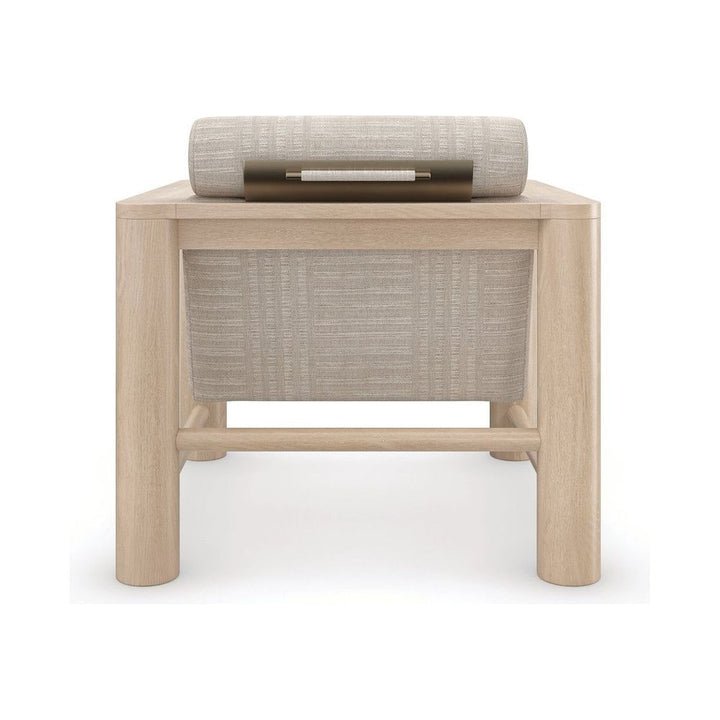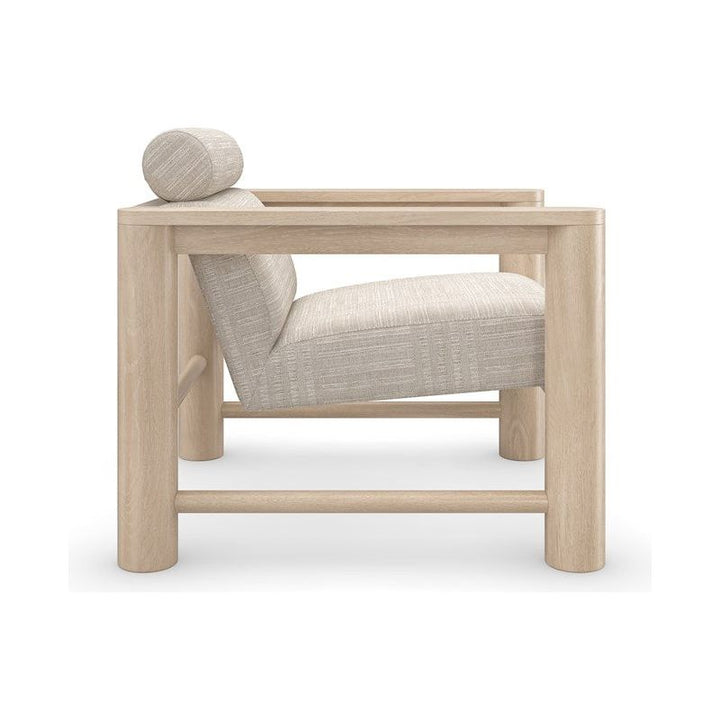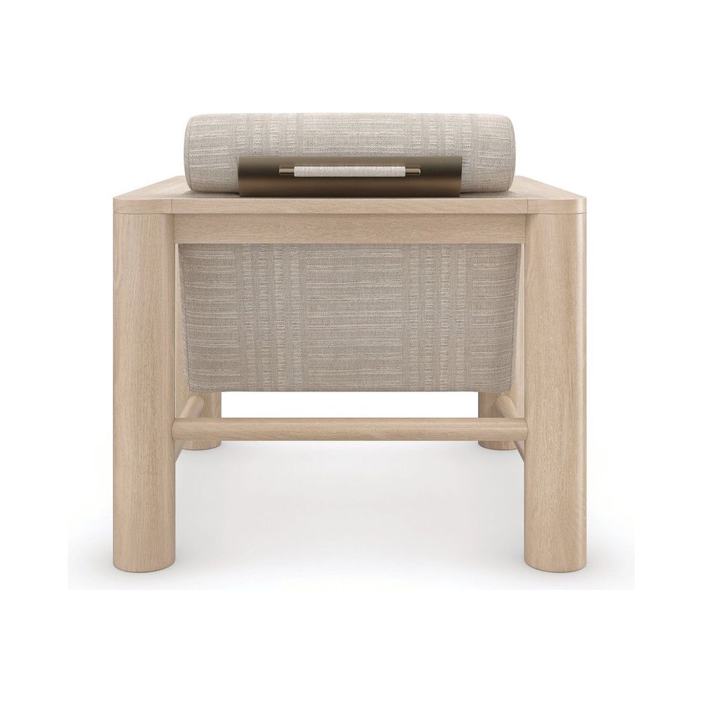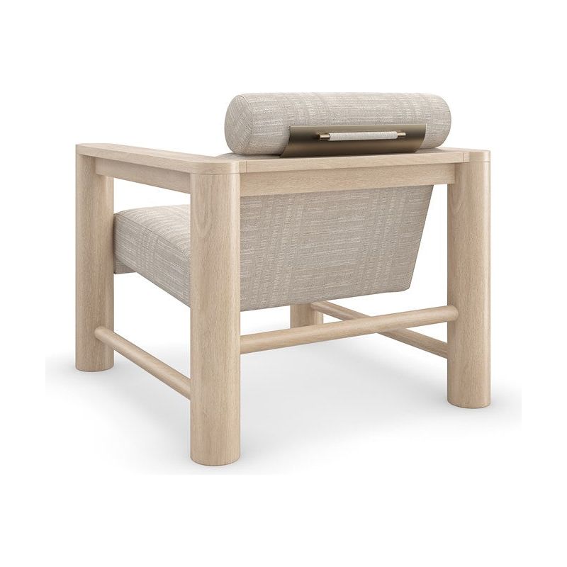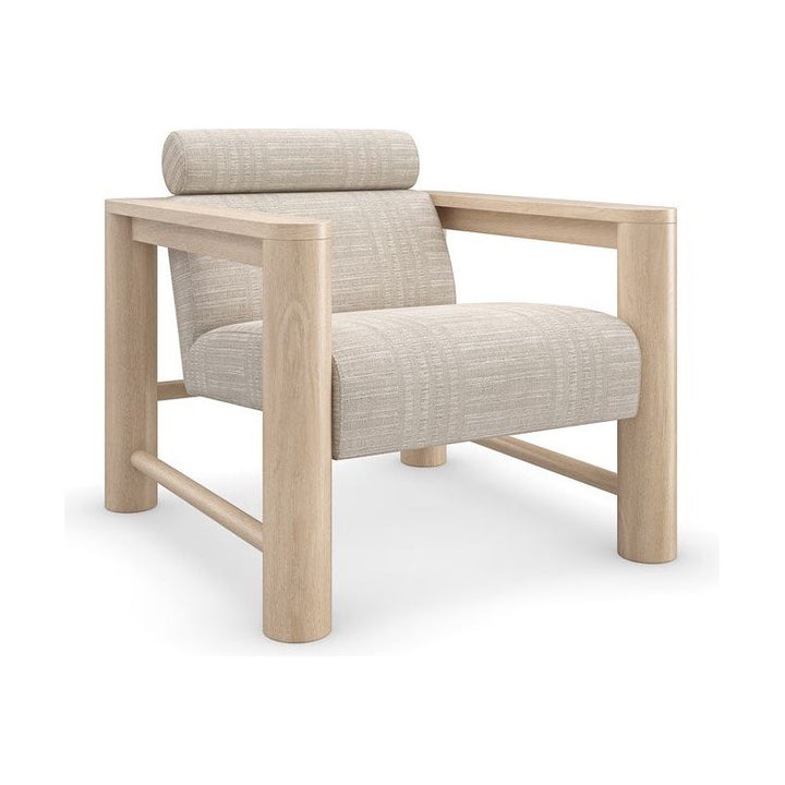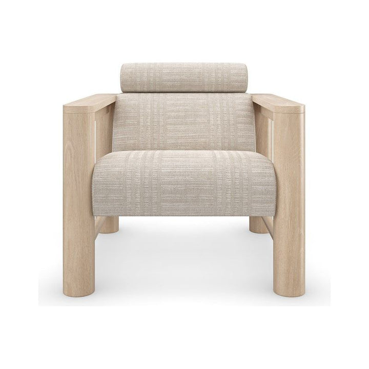 With a luxe, lounge-like aesthetic, this statement-maker exemplifies a unity of materiality, form and function. Features a pillared Sun Drenched Oak frame, softly contrasted by a tactile fabric that introduces a subtle stripe pattern. Style on its own, or in pairs to create a cozy space for laidback conversation.