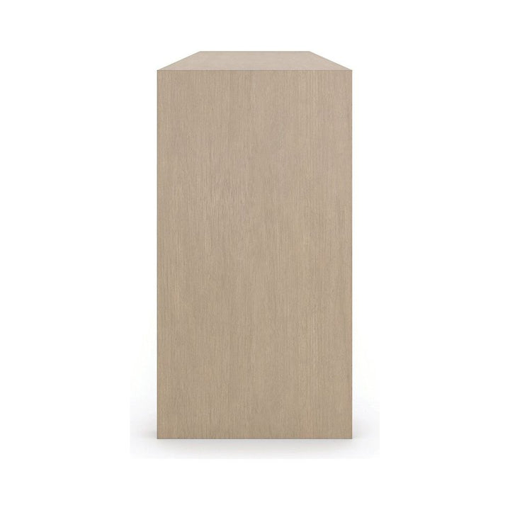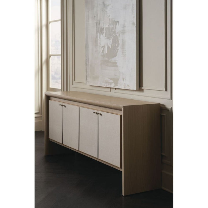 With a subtle contrast of light tones and textures, the Unity Credenza introduces an elegant modern aesthetic to living, dining, and home office interiors. Its clean-lined form is quietly accentuated by a Sun Drenched Oak finish and rounded bevel, framing soft-close doors wrapped in vinyl. Lucent Bronze metal trim adds warmth and a hint of shimmer. Completing this calming collective of materials and finishes: an Almost White-painted interior with adjustable shelves for versatile, tucked-away storage.