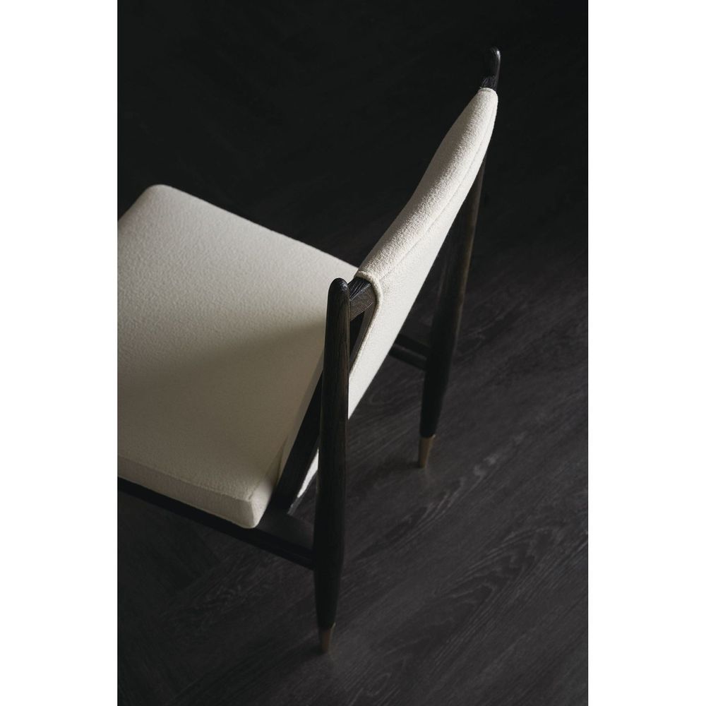 An elegant expression of materiality and form, the Unity dark dining chair is perfectly pitched for entertaining and the everyday. A clean-lined frame crafted in a Cinder-finished, open grain oak sets it apart from its light counterpart. Dressed in an ivory boucle fabric and Lucent Bronze metal ferrules, its dramatic contrast brings a sophisticated modern aesthetic to dining interiors.