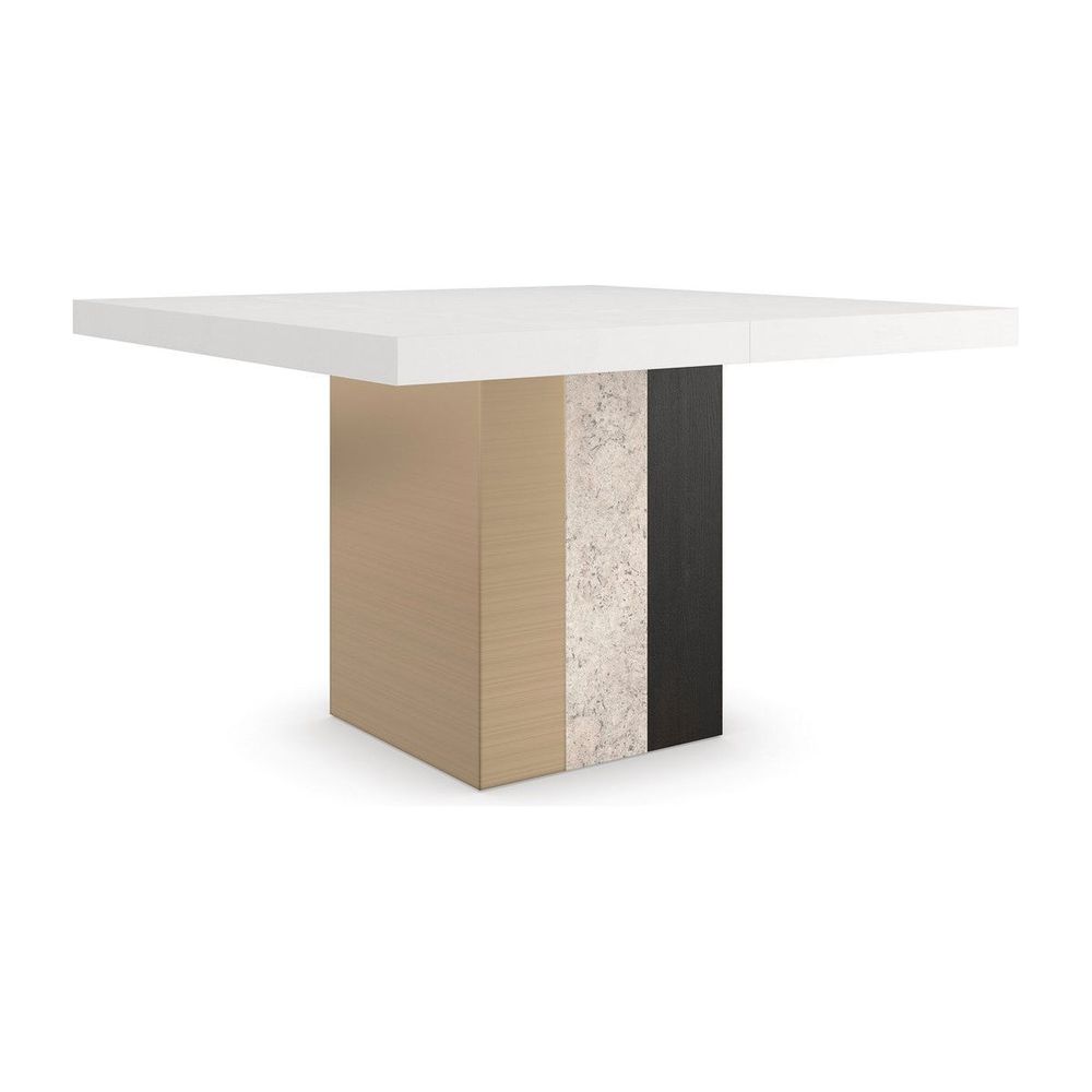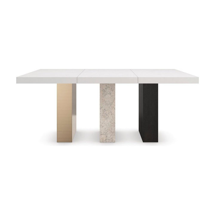 Form and function in perfect harmony: the Unity dark dining table makes a dramatic statement in a unique mix of materials. Architectural lines are punctuated by a tactile top in Burnished Adobe, balanced atop a pillar-style base crafted in travertine stone, Cinder-finished oak and Lucent Bronze Metallic metal. Style as a small pedestal for an intimate dining experience, or expand with two leaves for a larger gathering of guests. Table seats 10 when fully extended.