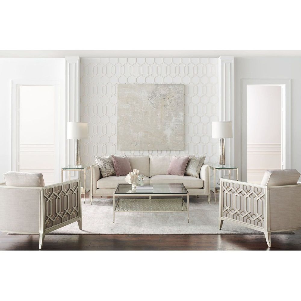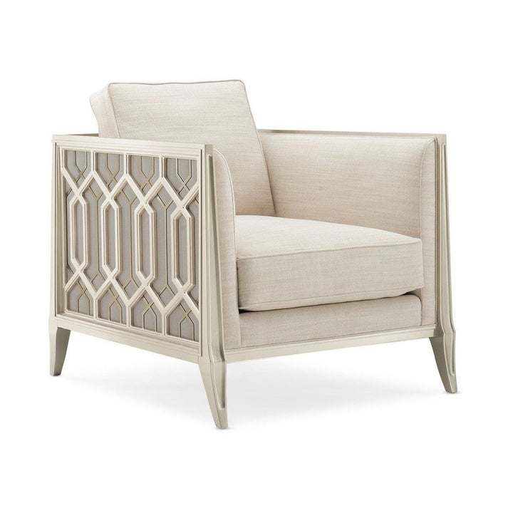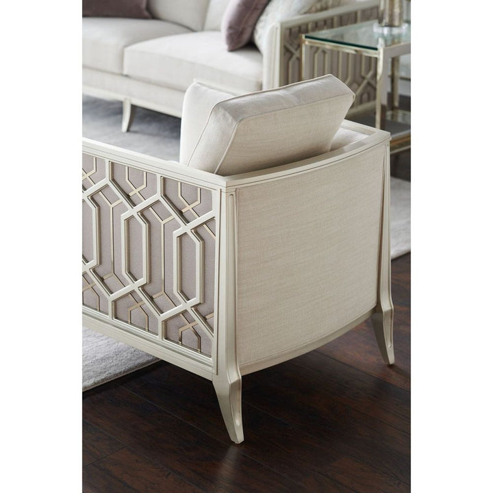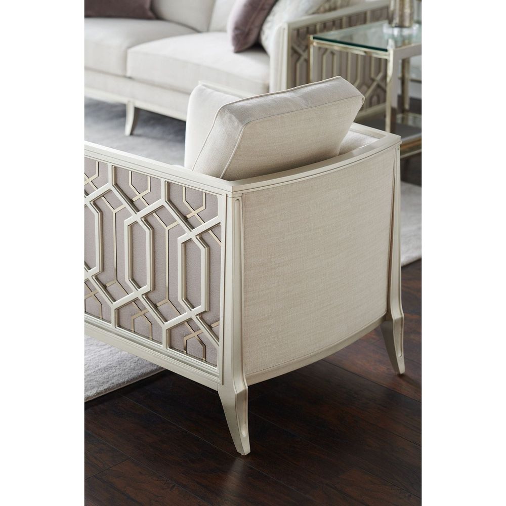 On a balcony railing of a former palace converted to a hotel in India is a carved pattern that was the muse for the pierced design found on this chair's outer arms. The idea of layering metal fretwork behind the wood was inspired by the dual shadow cast on the balcony by the setting sun through the railing's design. Creating a high-fashion look unique to itself, these elements are highlighted with illuminating shades of Soft Silver Paint and Champagne Gold and an exquisite cover.