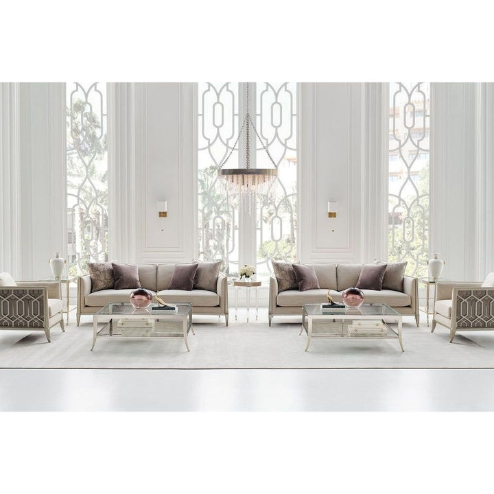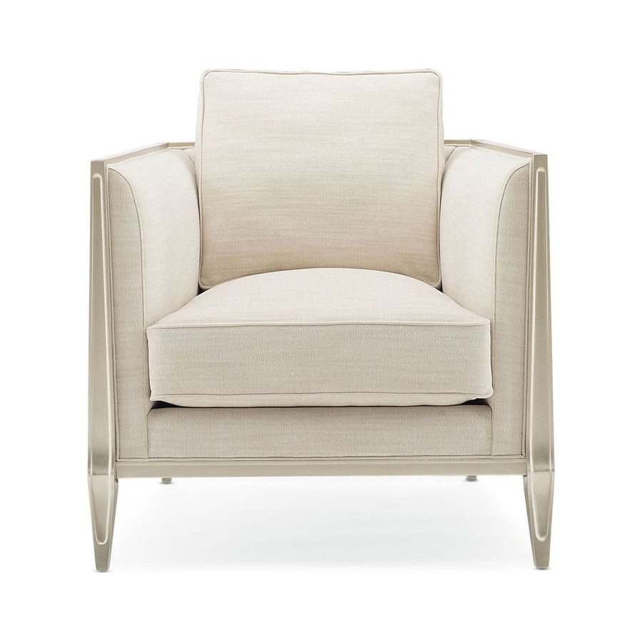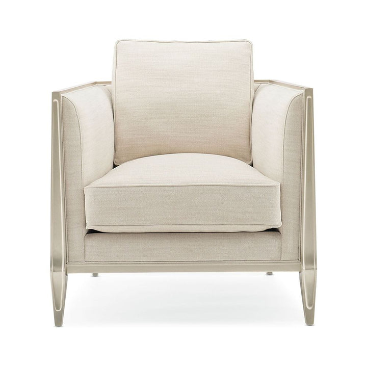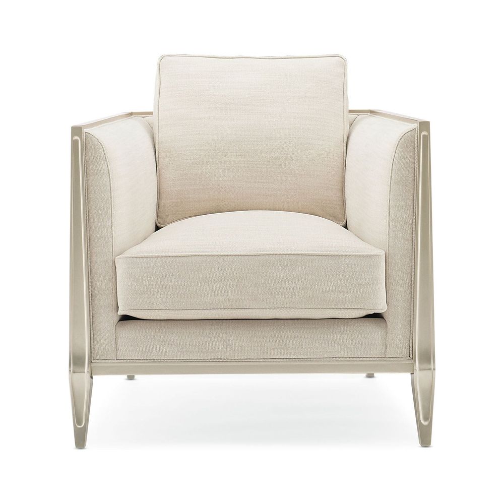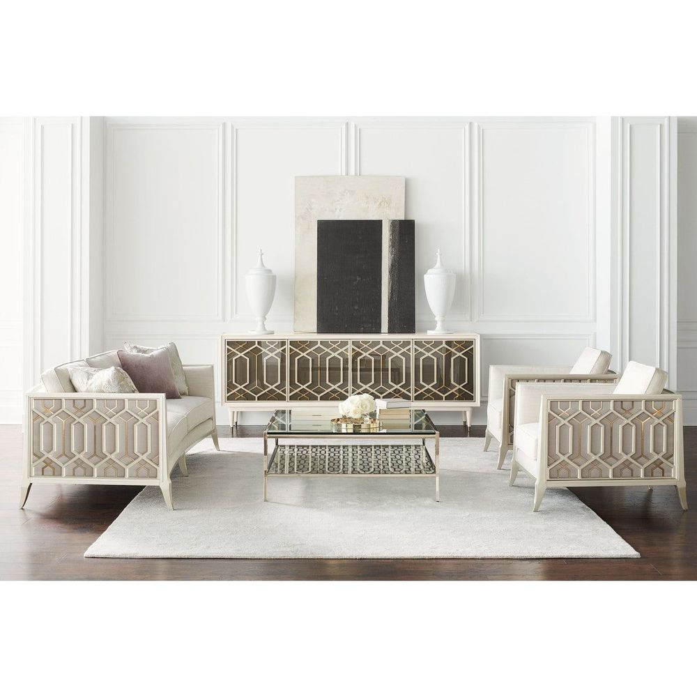 On a balcony railing of a former palace converted to a hotel in India is a carved pattern that was the muse for the pierced design found on this chair's outer arms. The idea of layering metal fretwork behind the wood was inspired by the dual shadow cast on the balcony by the setting sun through the railing's design. Creating a high-fashion look unique to itself, these elements are highlighted with illuminating shades of Soft Silver Paint and Champagne Gold and an exquisite cover.