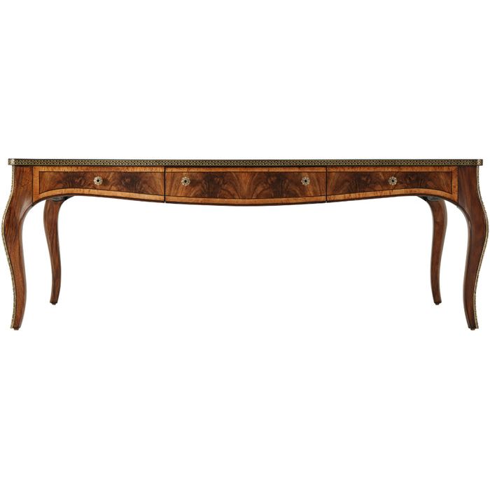 The Harper Cocktail Table consists of an elegant Etimoe Crotch, Karelian Burl and makore veneers with beautiful inlaid marquetry woodworking details on top. The frieze patterned drawer and elegant brass pulls provide extra storage.Theodore Alexander is shaped by English Heritage handcrafts furniture and accessories for your home with uncompromising quality. They also believe that the person who owns a piece of Theodore Alexander Furniture should take comfort in knowing the item can be viewed from any side and they have made the piece by using a time-honored, handcrafted method that is the true mark of high quality. Every piece of Theodore Alexander has a story just waiting to be shared.