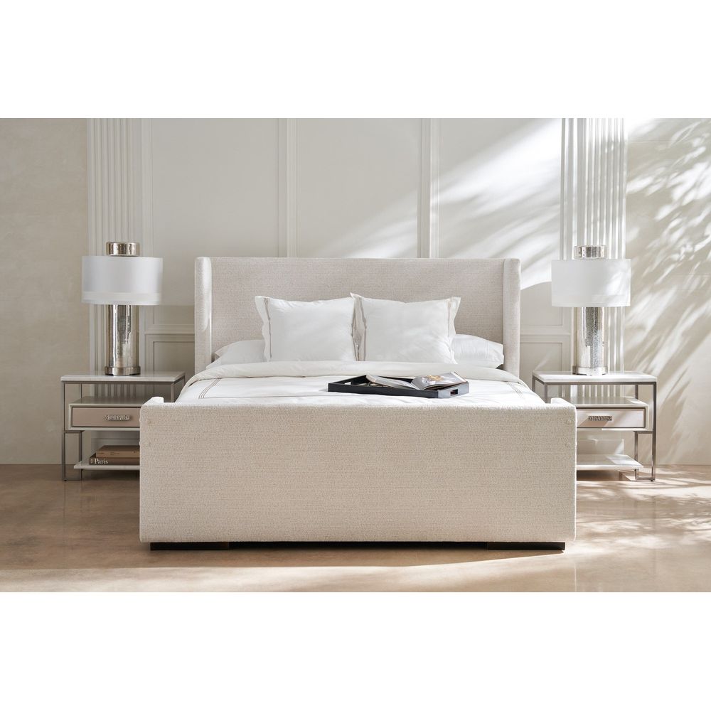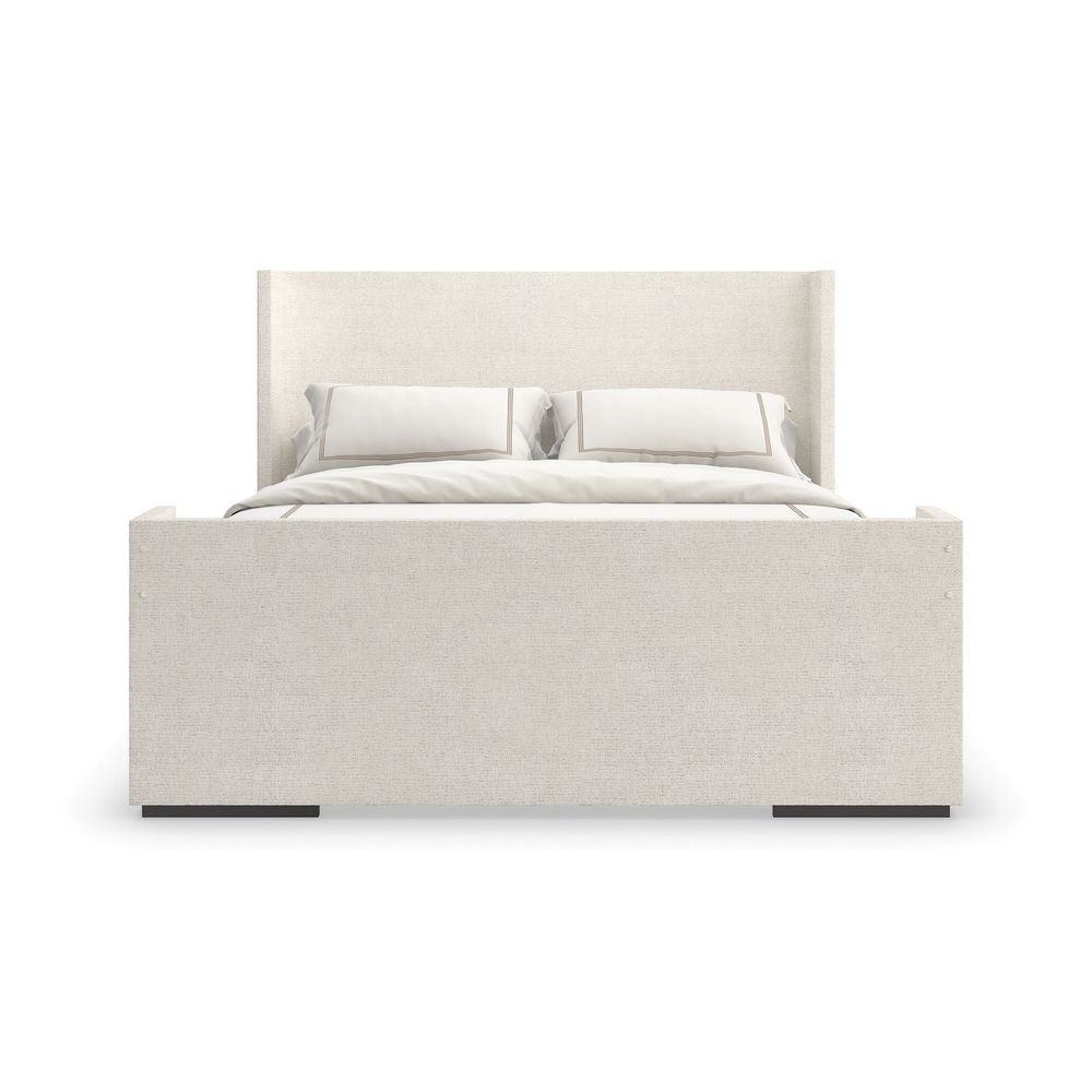Dressed in a soft chenille fabric, this shelter-style king bed brings an air of effortless elegance and enveloping comfort. Its simple, geometric form and soothing neutral hue blends beautifully with classic or modern design aesthetics. Features upholstered decorative buttons that cover brackets for fitting an optional, clean-lined canopy that adds a note of drama in an Almost Black finish.