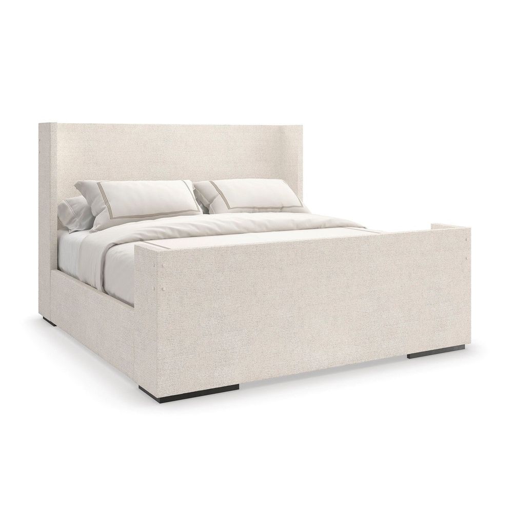 Dressed in a soft chenille fabric, this shelter-style queen bed brings an air of effortless elegance and enveloping comfort. Its simple, geometric form and soothing neutral hue blends beautifully with classic or modern design aesthetics. Features upholstered decorative buttons that cover brackets for fitting an optional, clean-lined canopy that adds a note of drama in an Almost Black finish.