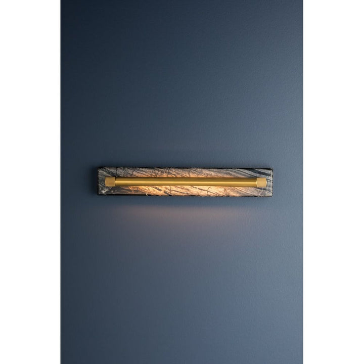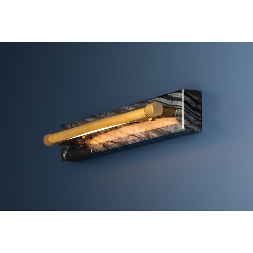 Hayden is where clean, precise design meets elevated, high-end materials. An aged brass tube with exquisitely detailed knurled ends rests upon a rectangular base of gorgeous honed nero madera marble. Versatility at its finest, hang Hayden vertically or horizontally; use it as a bath bar or a picture light. Available in three different sizes to work with any wall space.
