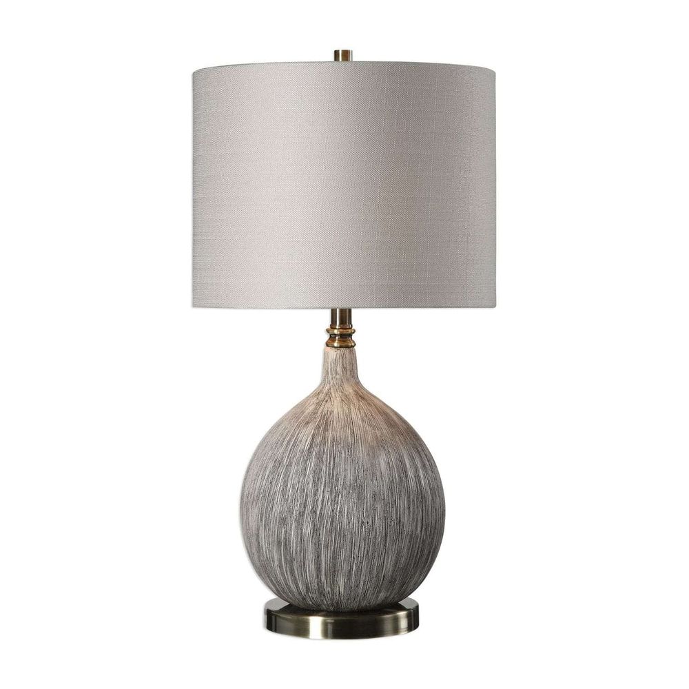 Organic Gourd Shaped Ceramic With A Heavily Textured Surface, Finished In An Old Ivory With Aged Black Undertones, Accented With Burnished Brass Plated Details. The Round Hardback Drum Shade Is A Light Beige Linen Fabric With Natural Slubbing.