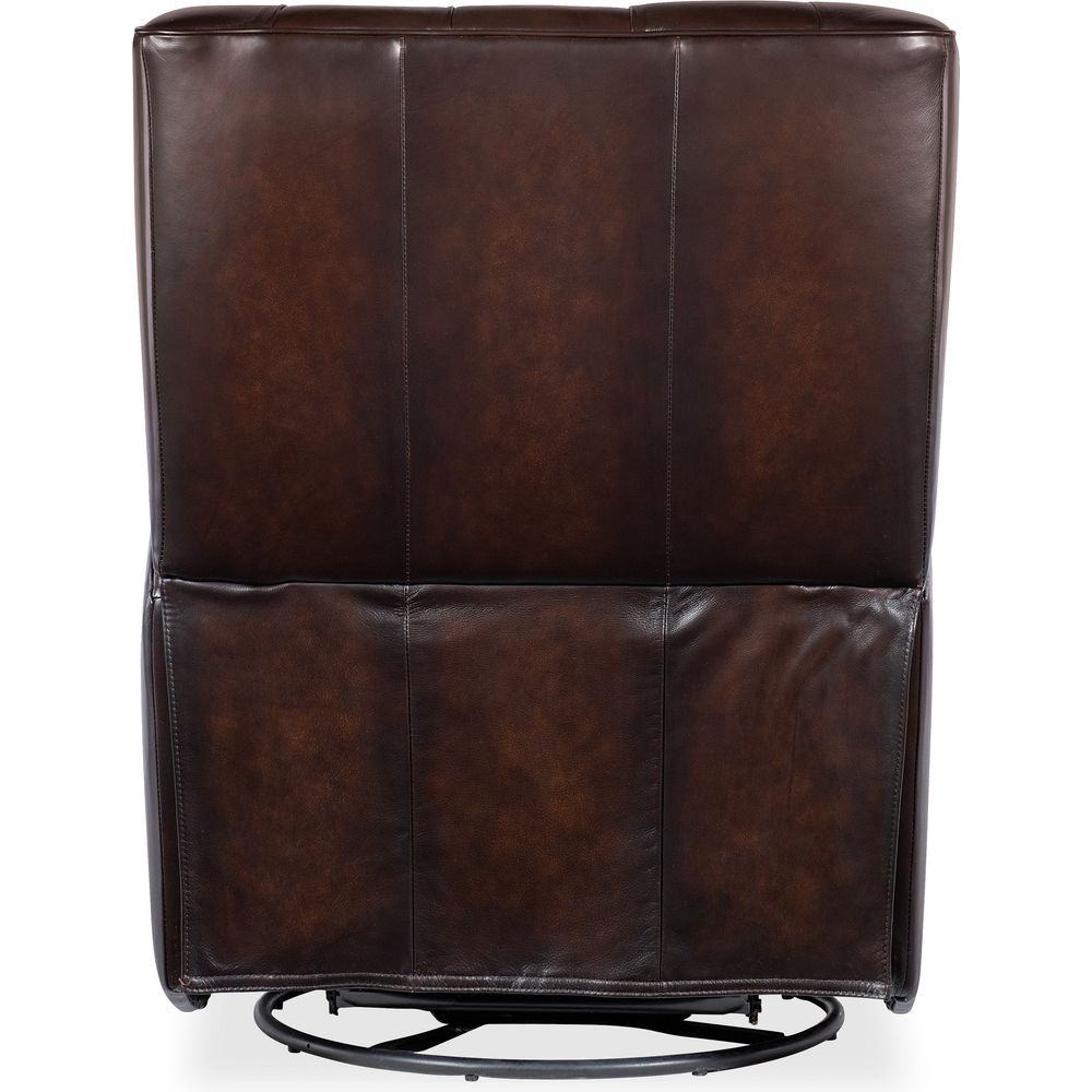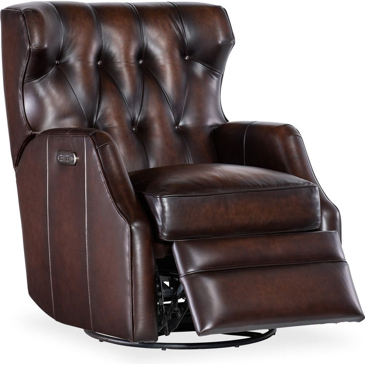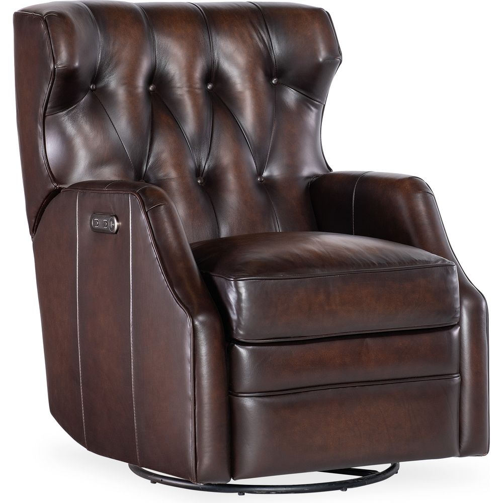 Description: Experience the Henderson Power Swivel Glider Recliner in Vortex 768-193 semi-aniline leather by Hooker Upholstery, a masterpiece of comfort and style. Featuring power recline and swivel motion, this recliner combines traditional elegance with modern functionality. The wing style back, button tufted details, and USB port make it an ideal choice for those who value both luxury and convenience in their home furnishings.