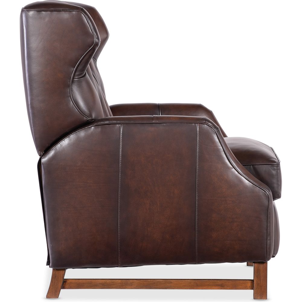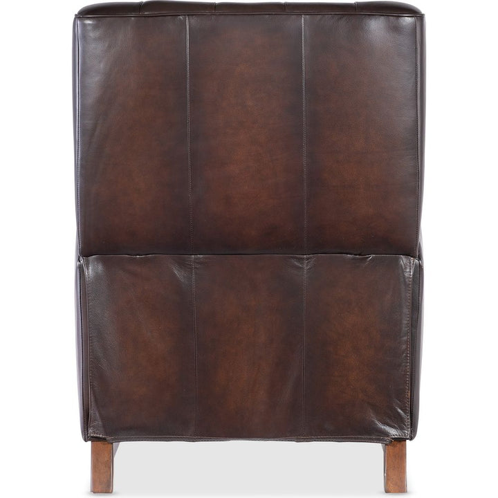 Description: Introducing the Henderson Press Back Recliner in Vortex 768-193 semi-aniline leather, crafted by Hooker Upholstery for those who appreciate traditional luxury. This manual recliner features a medium wood finished base and showcases a sophisticated wing style back with button tufted details. Perfectly complemented by square wood legs, it combines classic design with plush comfort, making it a standout piece in any formal living room or study.