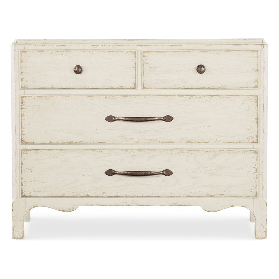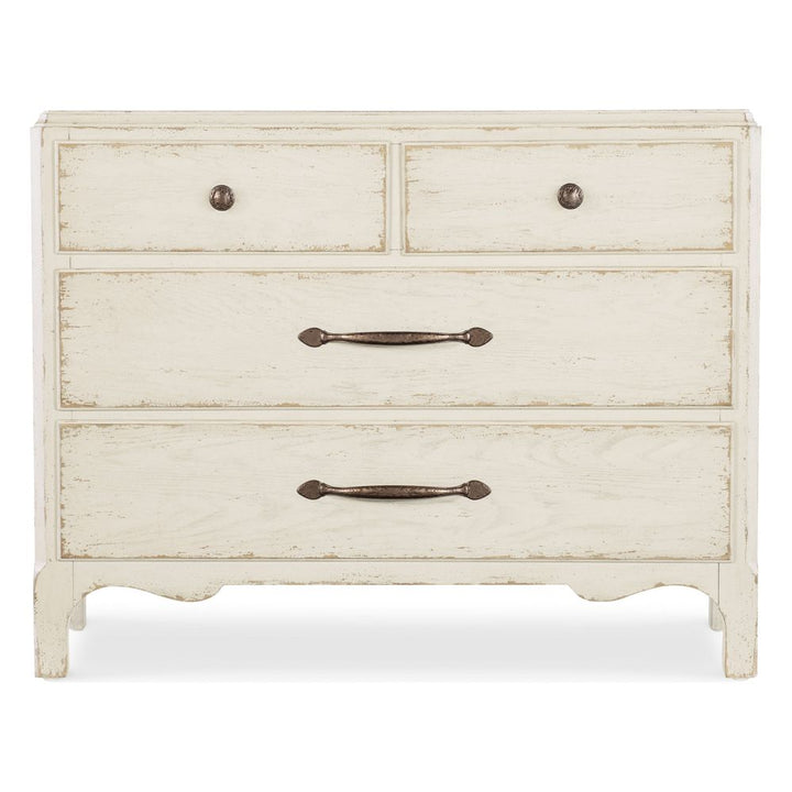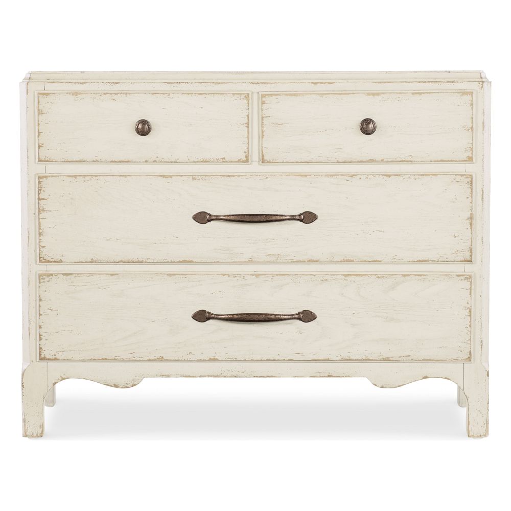 Description: In a classic, charming design with a nostalgic flair, the Heritage Bachelor Chest is reminiscent of a simpler, more genteel time. It has a scalloped shaped base and is finished in the timeworn white Daisy finish on Cathedral Oak Veneers. The four self-closing drawers have the warm Honey interior finish. Metal alloy bar and knob pulls are in an antique bronze finish.