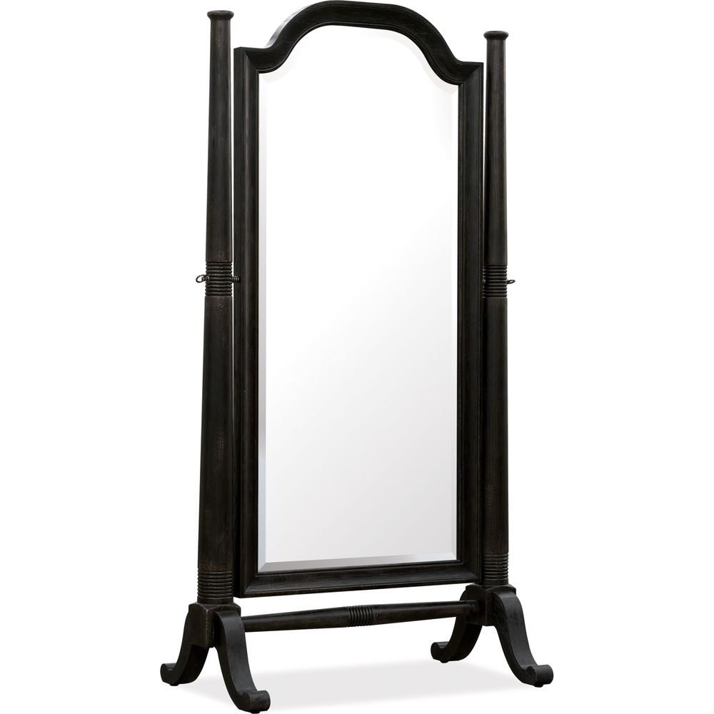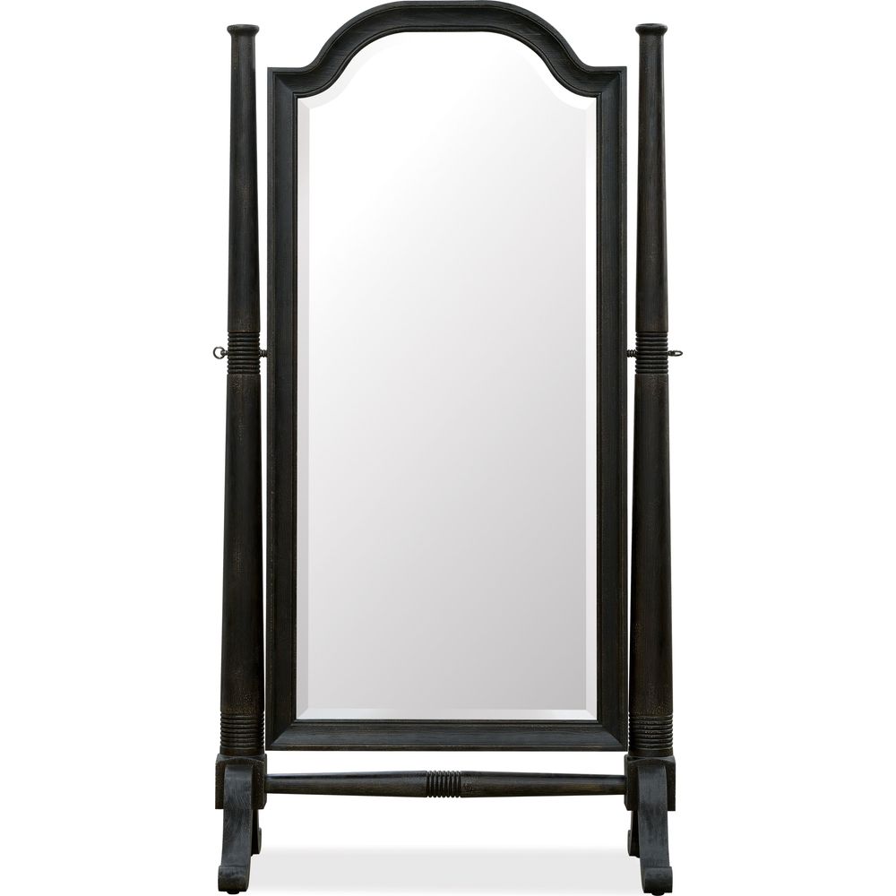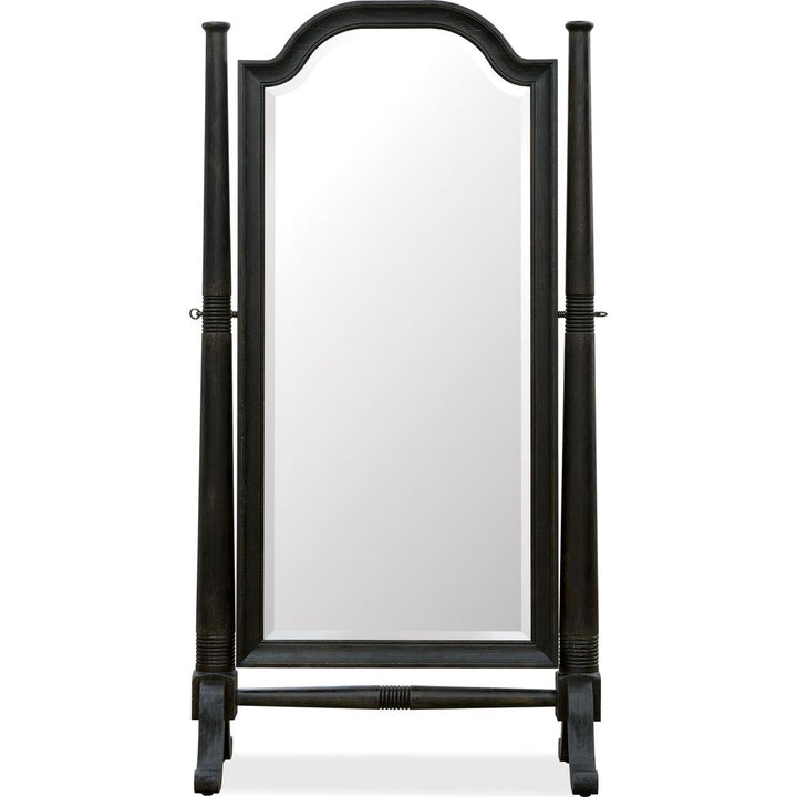 Description: Celebrating the winsome beauty of a simpler time, the Heritage Tilting Floor Mirror has beveled glass and carved accents on the posts and stretcher. The Molasses finish over Cathedral Oak Veneers captures the essence of a well-loved heirloom passed down through the generations. The deep dark tone over the Oak Veneers adds warmth, while the variations in color reveal the natural beauty of the wood beneath.