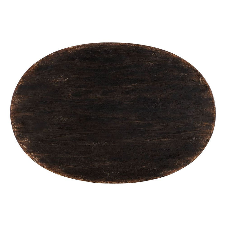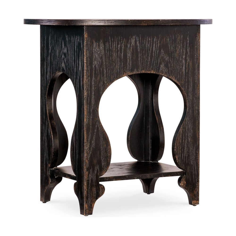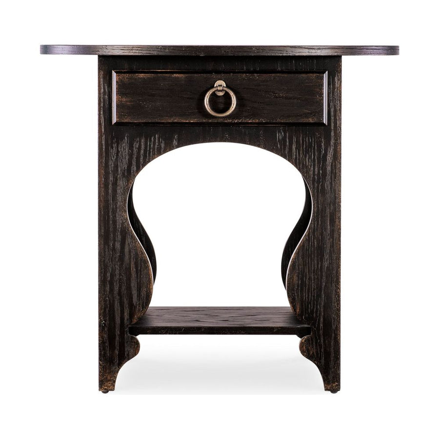 Description: In a classic, charming design with a nostalgic flair, the Heritage One-Drawer Oval Nightstand has ornately shaped legs that form the shape of a keyhole on the front, sides and back. Crafted of Oak Veneers, it is finished in the deep, dark Molasses finish, with drawer interiors in the warm Honey finish. The drawer is self- closing.
