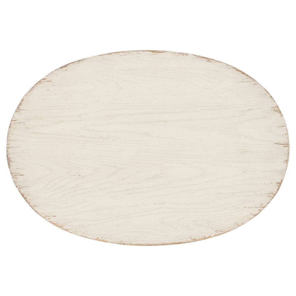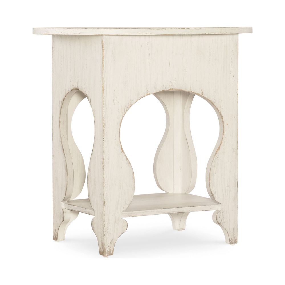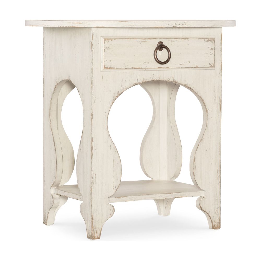 Description: In a classic, charming design with a nostalgic flair, the Heritage One-Drawer Oval Nightstand has ornately shaped legs that form the shape of a keyhole on the front, sides and back. Crafted of Oak Veneers, it is finished in the timeworn white Daisy finish, with drawer interiors in the warm Honey finish. The drawer is self- closing.