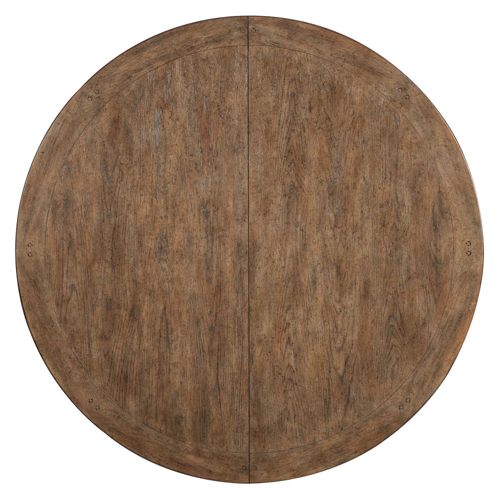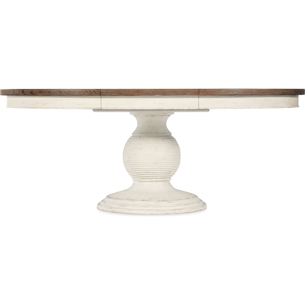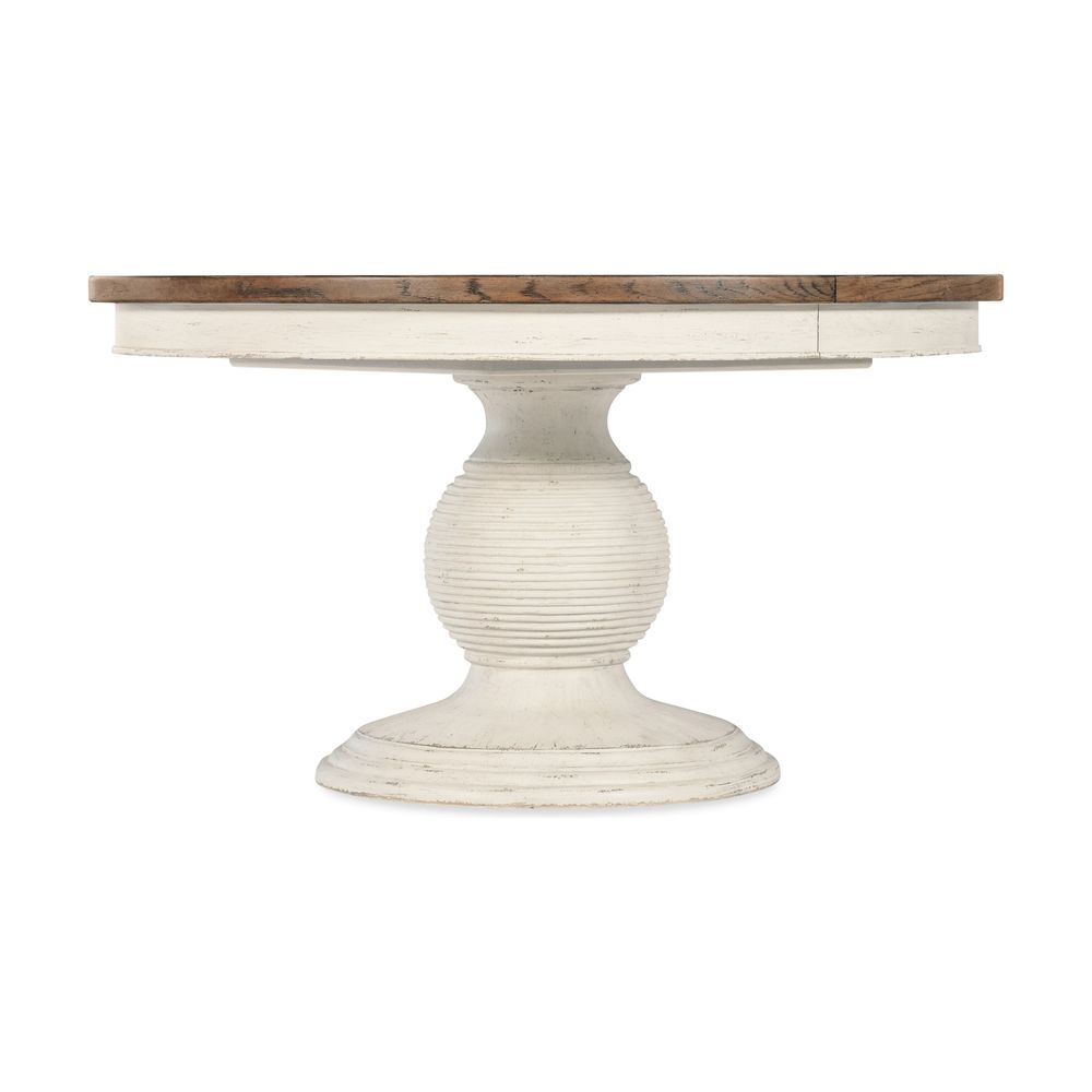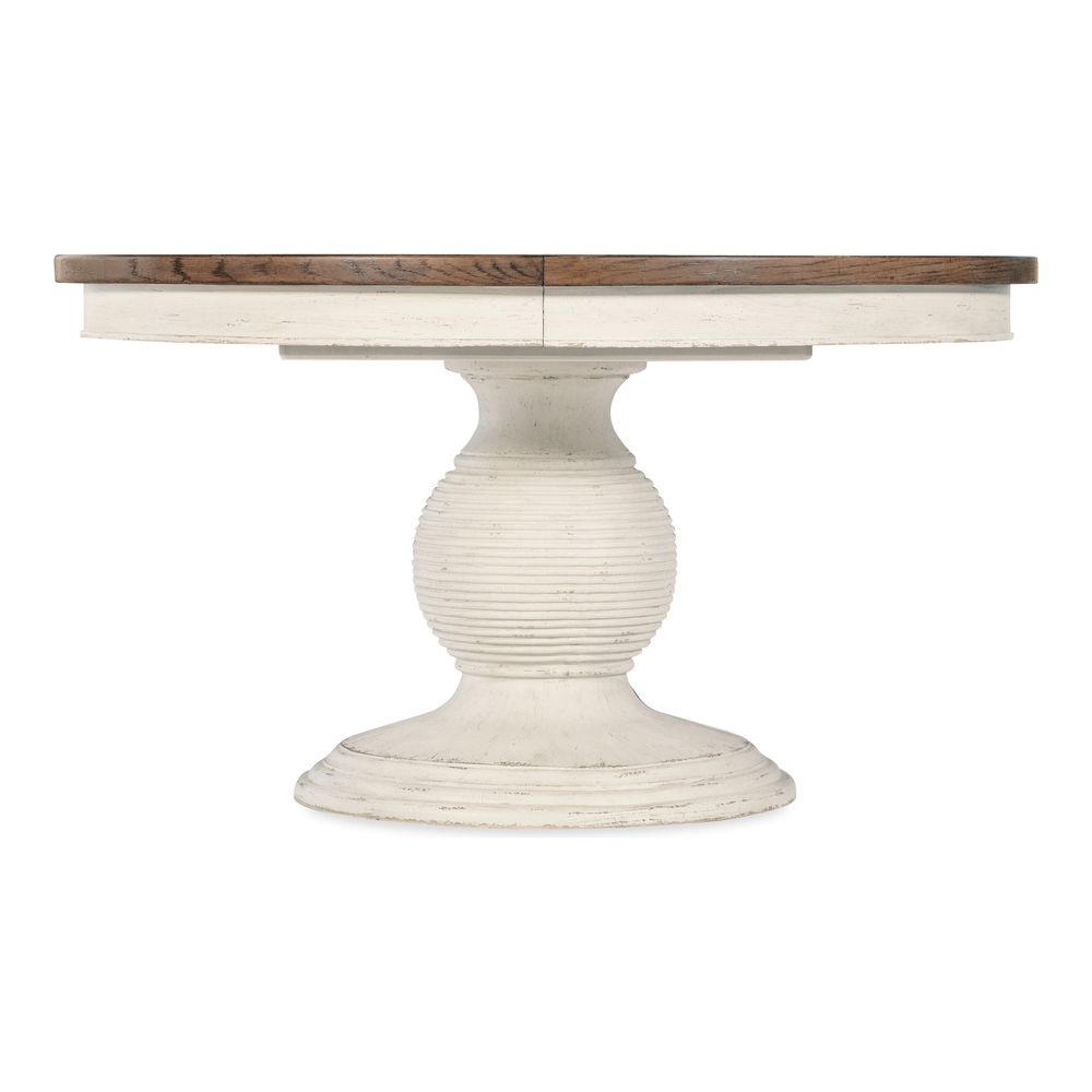Description: Combining the time worn white Daisy finish on the base and the warm Honey finish in a soft brown tone on the top, the Heritage Round Pedestal Dining Table harkens back to a simpler, more genteel time. Crafted of Oak Veneers with a Solid-Wood Edge Top, it has a carved pedestal base. With the 22-inch leaf in place, the table extends to 76 inches round and accommodates up to two coordinating benches and two armchairs and up to 8 coordinating armchairs or side chairs. Without the leaf, it accommodates up to 6 coordinating arm or side chairs.