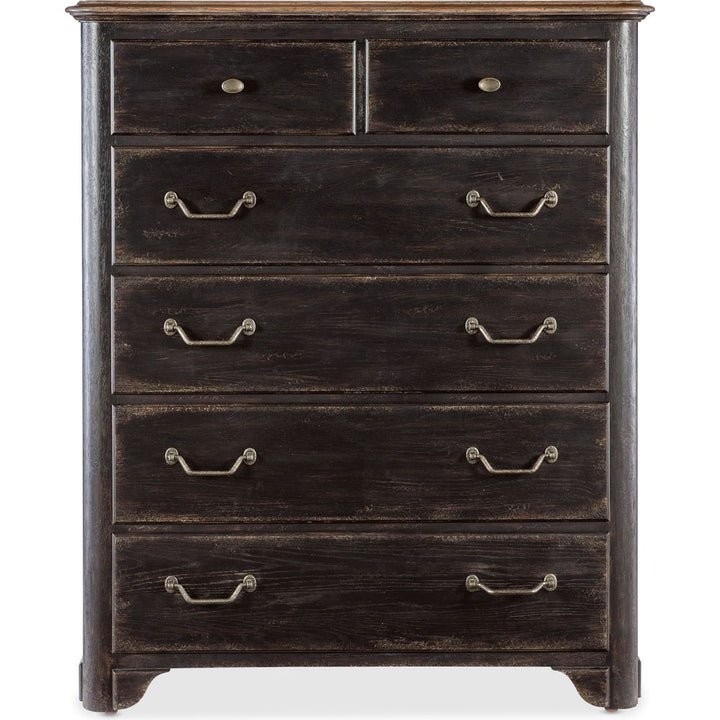Features: Six self-closing drawers; Top drawers with black removable felt liner; Bottom drawer is cedar lined; Drawer interior is in Honey finish; Two-tone finish