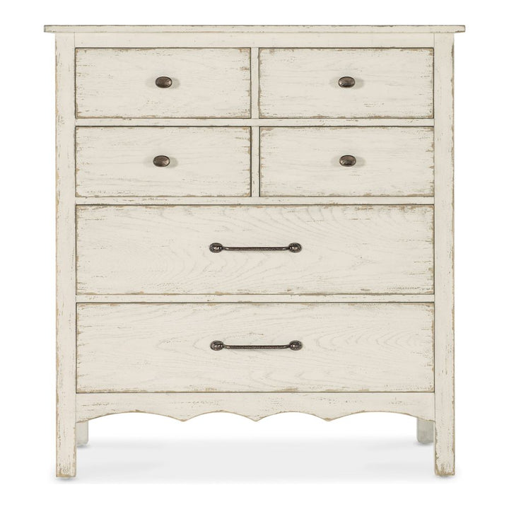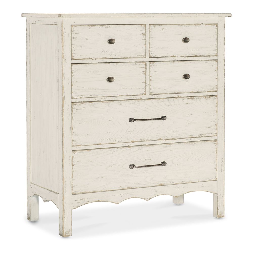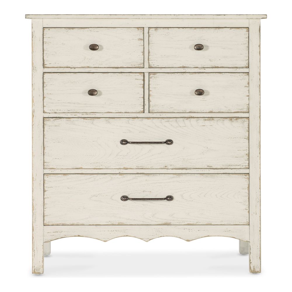 Description: In a classic, charming design with a nostalgic flair, the Heritage Six-Drawer Chest is crafted of Oak Veneers with a Solid-Wood Edge Top, a scalloped-shape base and finished in the time-worn white Daisy. The drawers are self-closing and finished on the interior in the warm Honey color. The top drawers have a black removable felt liner and the bottom drawer is cedar-lined. Metal alloy knob pulls have an antique bronze finish.