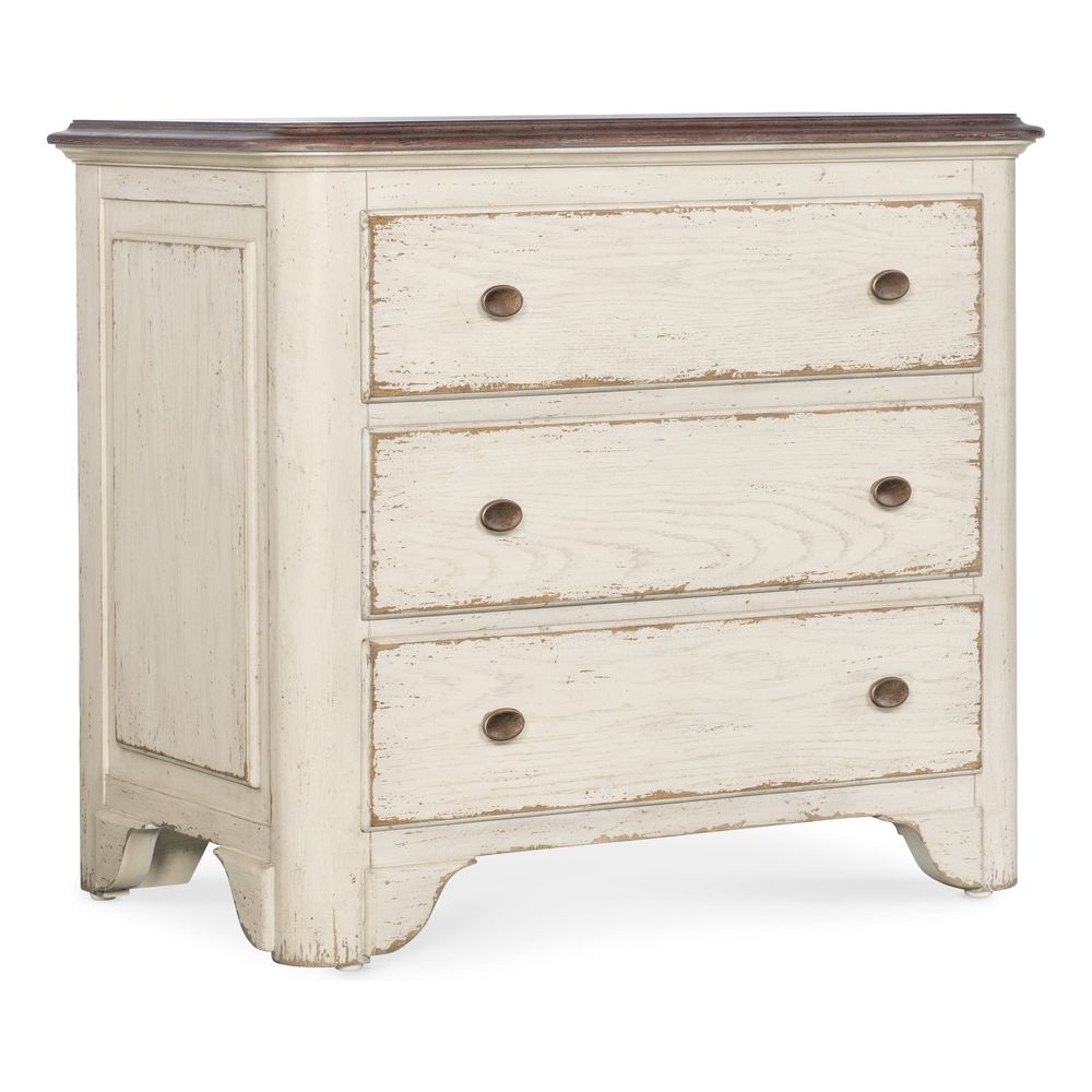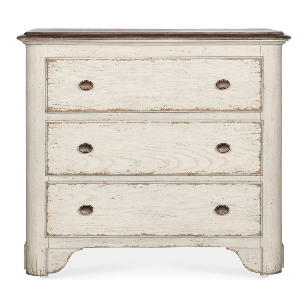 Description: In a two-tone finish with the time-worn white Daisy on the base and the warm Honey on the top and drawer interiors, the Heritage Three-Drawer Nightstand is a classic, charming design with nostalgic flair. There are 3 self-closing drawers and a solid-wood edge top. Crafted of Oak Veneers with metal alloy pulls in an antique bronze finish.