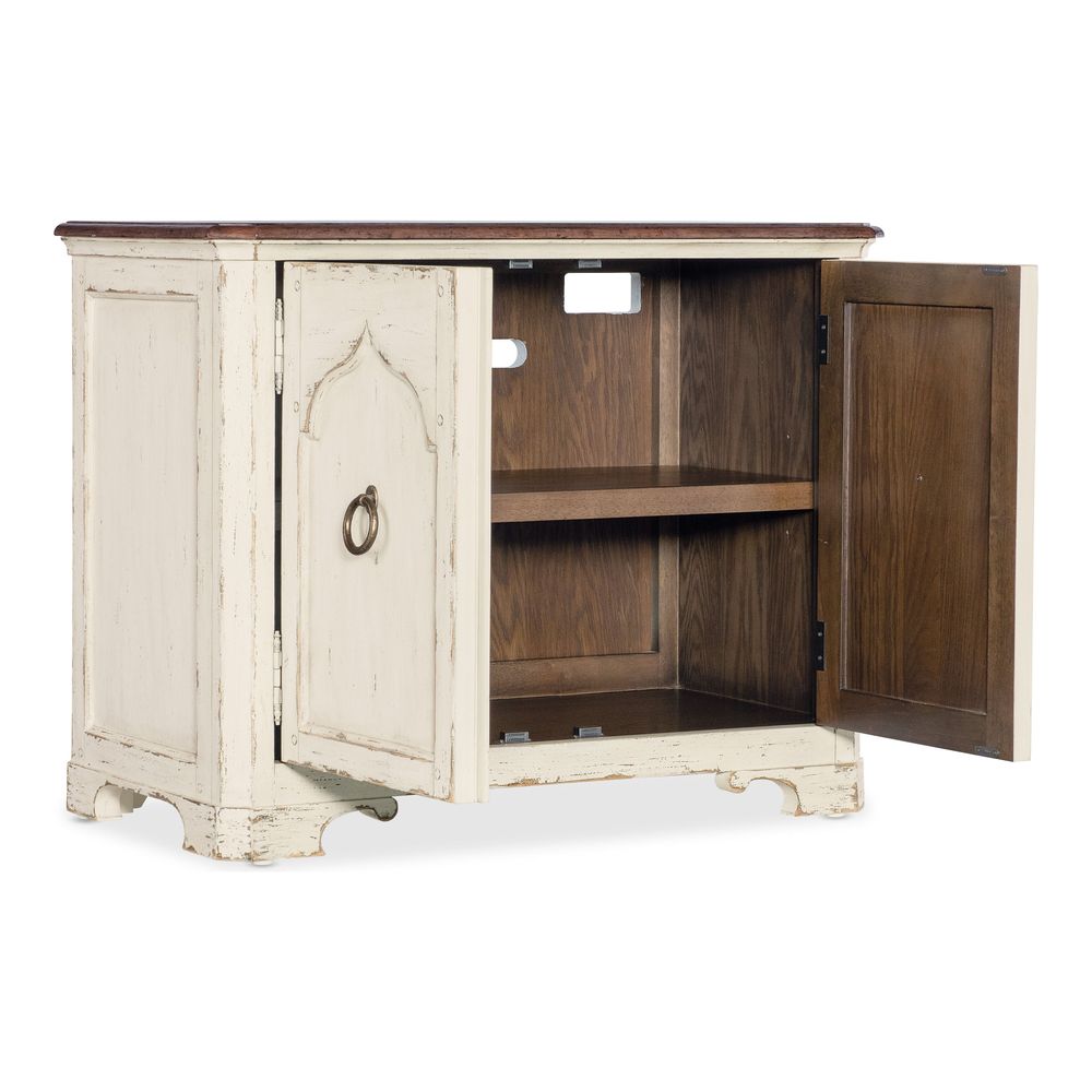 Features: Two doors with magnetic catches; One adjustable wood shelf behind doors; Interior finish is in Honey; Ventilated back panel with wire management holes; Scroll accents on base; Shaped carved door fronts; Two-tone finish