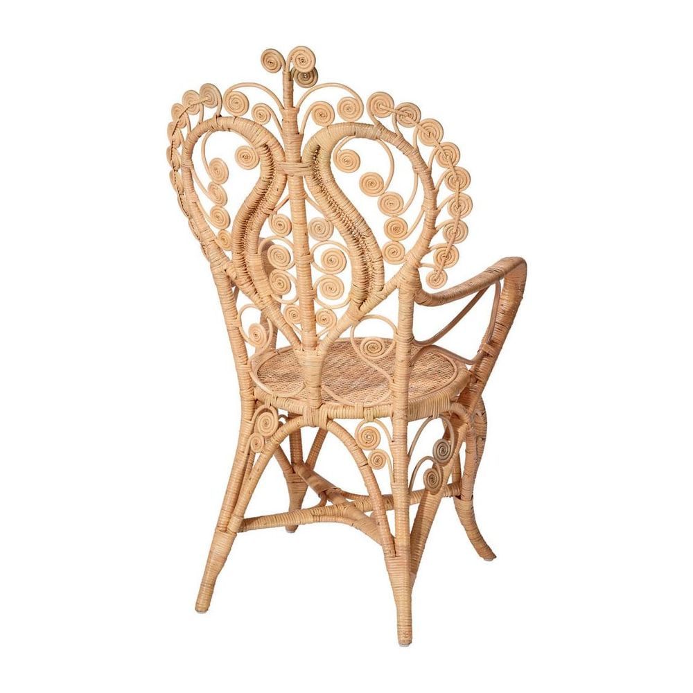 This is a chair that evokes thoughts of tall drinks, gentle breezes, and warm conversations. Handwoven of natural rattan, a sustainably harvested and eco-friendly material, its throne-like shape, and lavish embellishments delight.