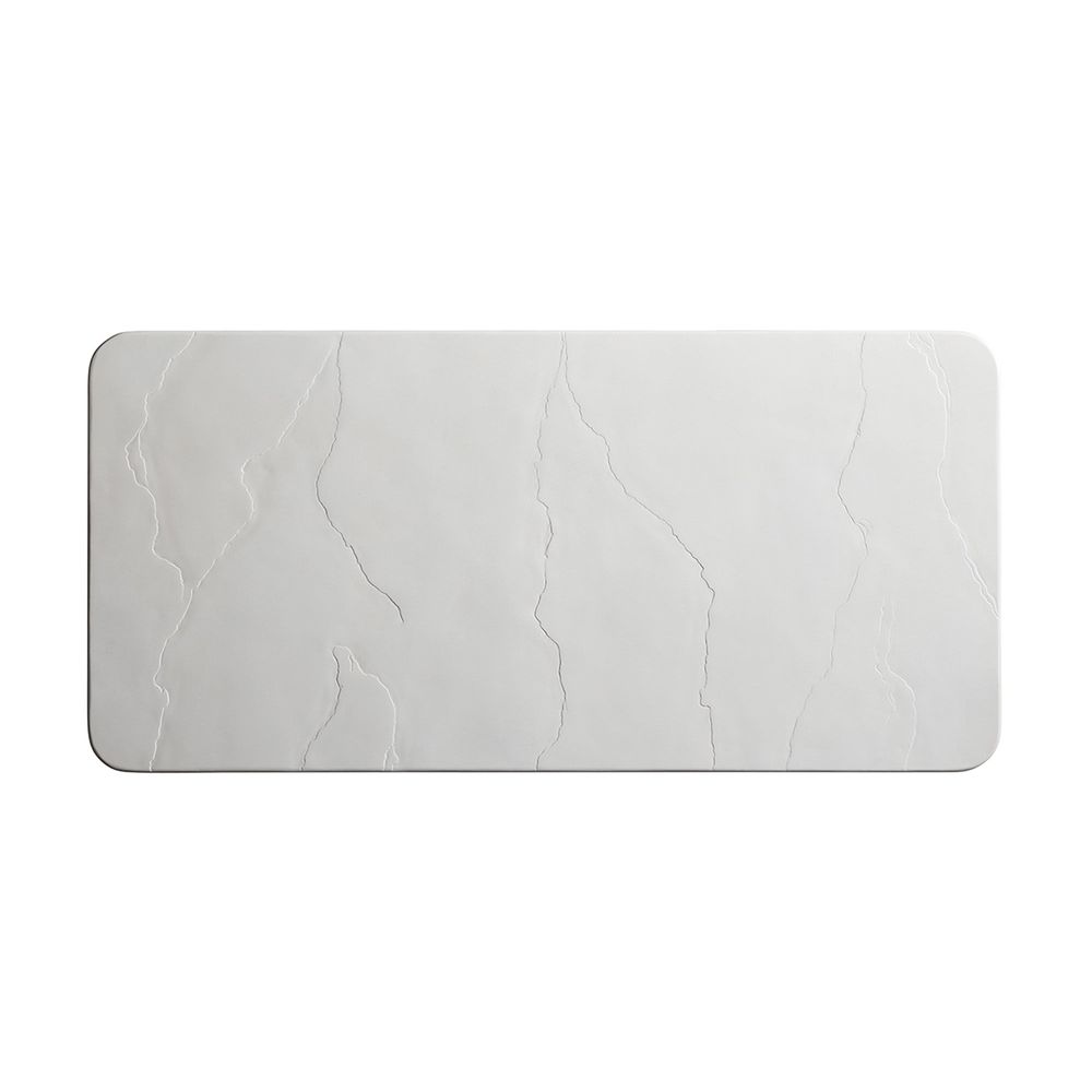 Feature 1: The bistro features a removable 6-inch addition under the table surface to adjust to either counter stool or bar stool heights. The design includes clean architectural lines with a cross-stretcher at the base and contemporary flared legs in a sophisticated, lightly textured graphic finish. The top is a durable all-weather surface to emulate the look and feel of honed natural limestone, in a soft ivory coloration, for a classic look.