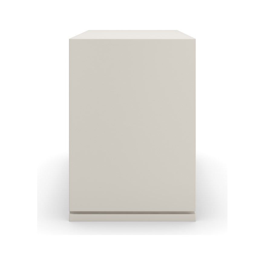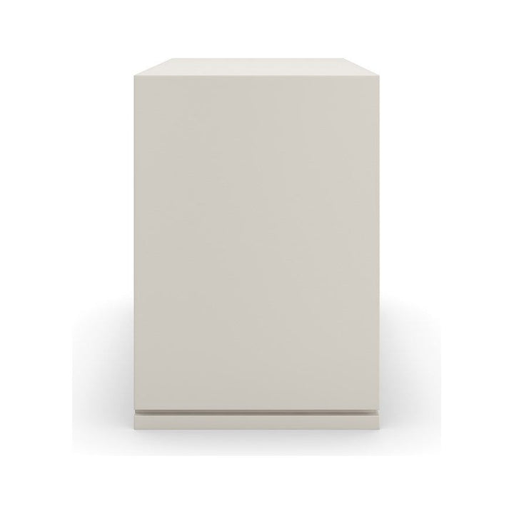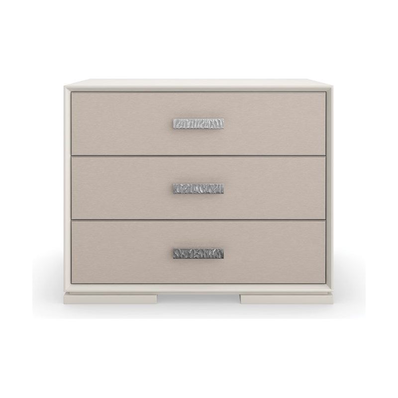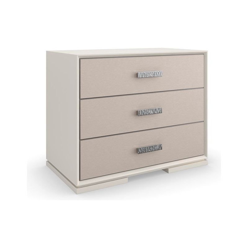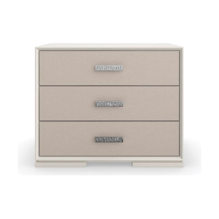 A simple form elevated by luxe materials, this classic nightstand brings a hopeful glimmer and sensory experience to bedroom interiors. Inspired by a grand, vaulted dressing room seen by designers while in Milan, vinyl-wrapped drawer fronts are meant to emulate the striation and soft blush color of Venetian silk adorning closet doors. Undulated hardware in Brushed Stainless adds tactile appeal, complemented by a lacquered, Almond Milk finish. Three soft-close drawers offer ample space for neatly keeping bedside essentials.