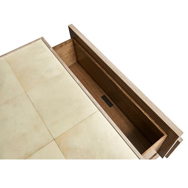 - Material: Oak Solids, Parchment, Flat-Cut Random Match Oak Veneers, Glass, Brass