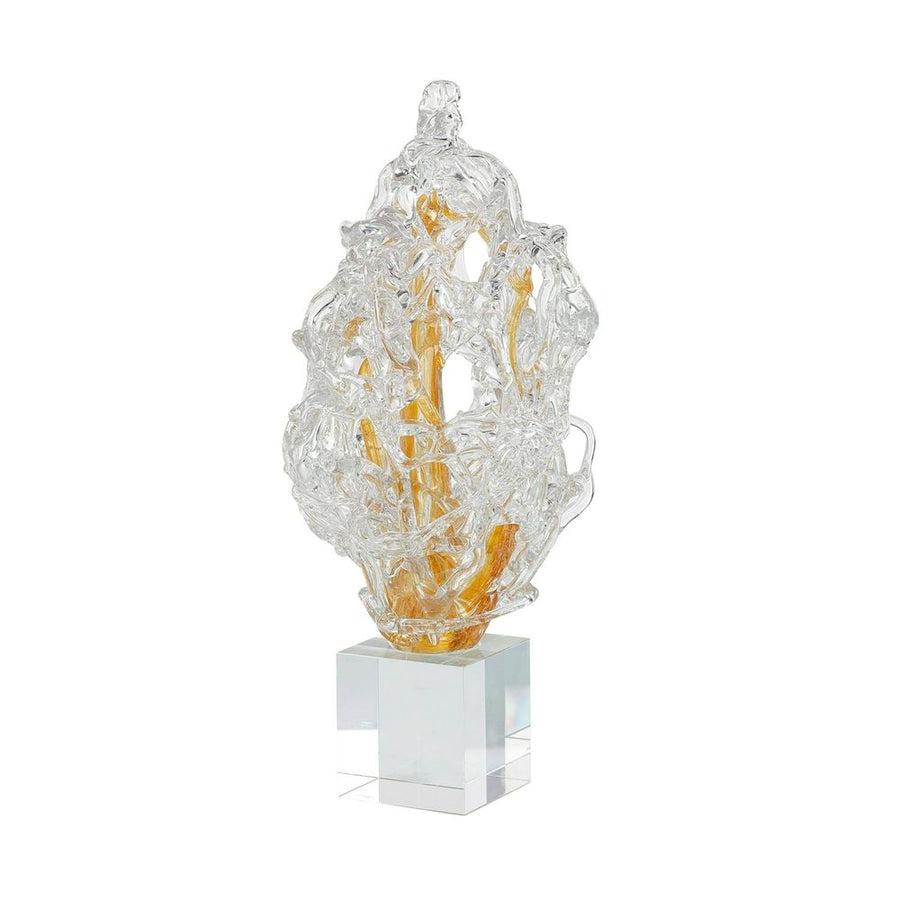 The Icy Flame Sculpture is a gorgeous design statement that captures the unpredictable beauty of a raging fire. Crafted from mouth-blown art glass, the abstract sculpture displays clear tones around the exterior, enveloping subtle golden wisps in the center. This beautiful sculpture gracefully sits atop a square base of clear crystal.