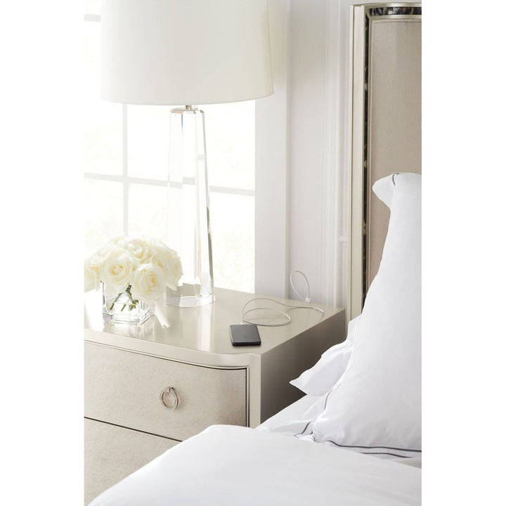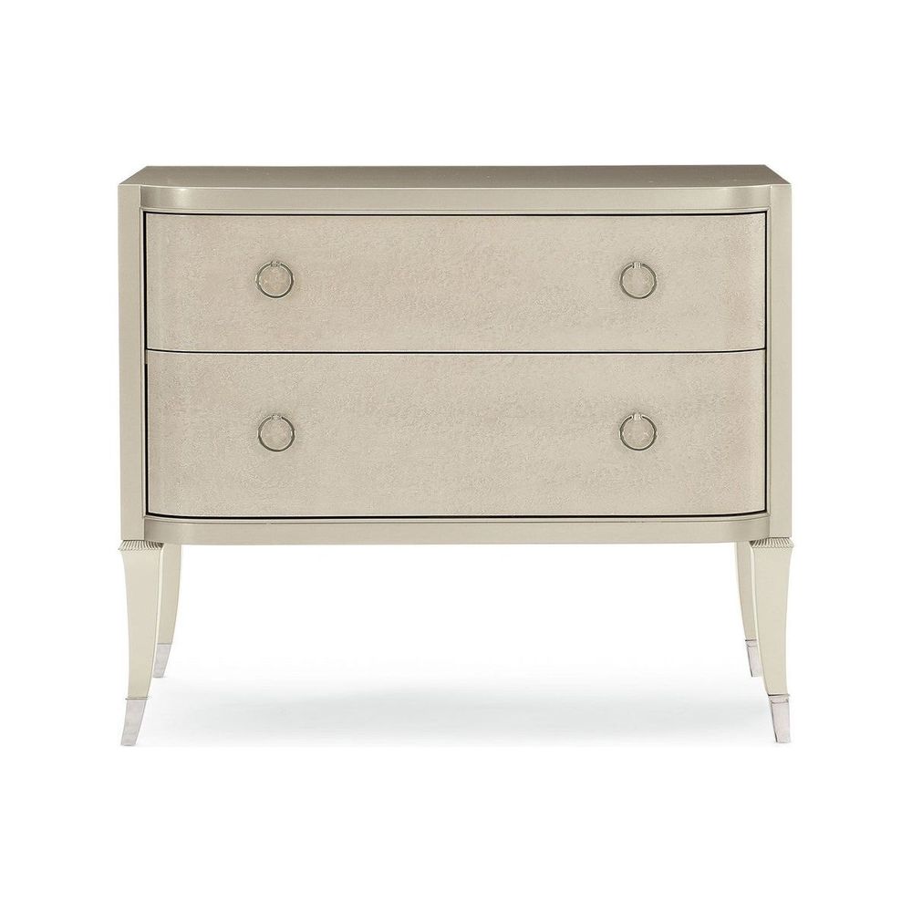 With effortless elegance, this sophisticated nightstand makes the perfect mate for any stylish bed. Designed to keep nighttime essentials close at hand, it wears a Soft Silver Paint finish and offers two drawers with painted interiors in the same soothing hue. Each drawer face is accentuated by an exquisite Smoked Birdseye finish complemented by shimmering, jewelry-like ring pulls while metal ferrules in Polished Stainless Steel cap its gently curved legs.