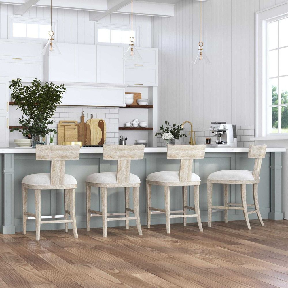 This modern take on a klismos chair features a curved wood frame in a whitewashed finish, with wire brushed details revealing natural pine wood undertones. Paired with a white slubbed performance fabric cushion. Seat height is 26".