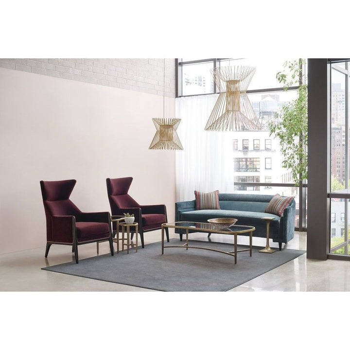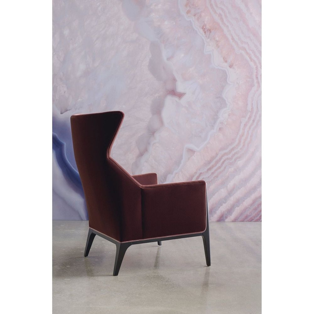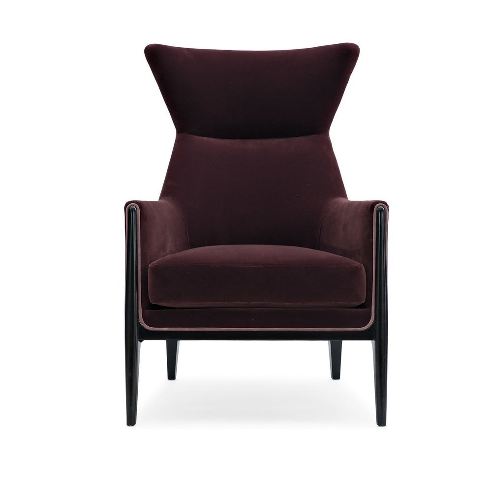Featuring style that knows no boundaries, this unique chair is rich in color, material and presence. It represents an artist's interpretation of the classic wing chair and is destined to shine in any setting. Its bold mo-velvet cover is featured in a rich shade of eggplant that shimmers and shines when it catches the light. A coordinating amethyst velvet welt adds another layer of distinction and is complemented with a Satin Ebony finish on the chair's wood trim. With the power to instantly modernize a space, this distinctive chair works beautifully on its own or as a pair across from a sofa or fireplace.