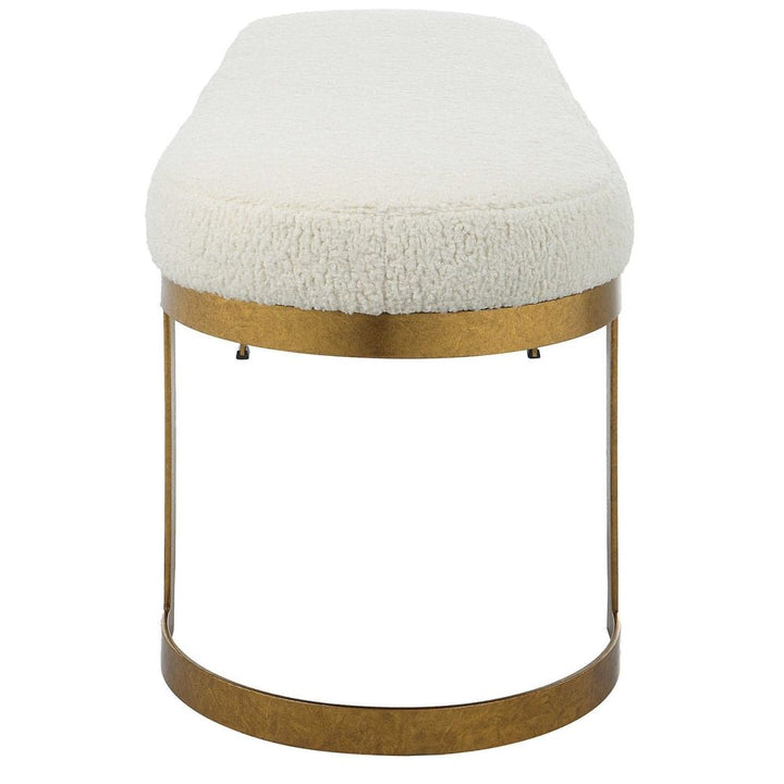 Merging simplicity with style, this bench features a thick hand forged iron base finished in mottled antique gold leaf. The plush seat is upholstered in natural faux shearling fabric.