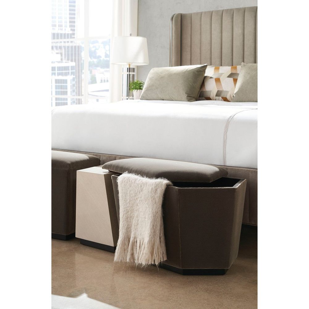 At the height of luxury, this masterfully upholstered bed makes an indulgent statement in a smooth, low-pile velvet. Vertical channel tufting goes uninterrupted, except for a slight dip at the center of the headboard for a hint of drama and artistic expression. Dark Chocolate wood trim adds a defining accent and rich contrast, complemented by tapered metal legs along the front in a Deep Bronze finish.
