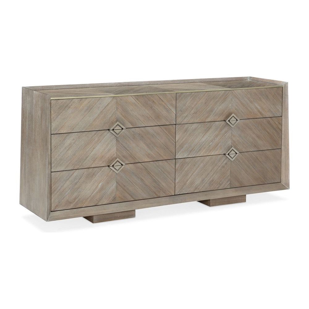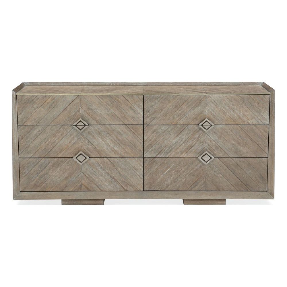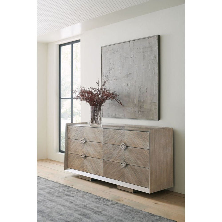 Destined to be the focal point of the room, there's no denying this six-drawer dresser is ready to "WOW." With a simple silhouette and clean lines, its design highlights the inherent beauty of natural materials. Perfectly matched directional woodgrain veneers create a one-of-a-kind chevron pattern that attracts the eye and creates an understated design statement. An easygoing shade of Ash Driftwood brings out the beauty of these stunning veneers and is sure to complement your room's decor. The subtle sparkle of a bead of Sundance Gold gives the top edge a touch of luxe. Open any drawer and you'll find a fully finished interior, wearing an elegant shade of Putty, ready for a few of your favorite things.