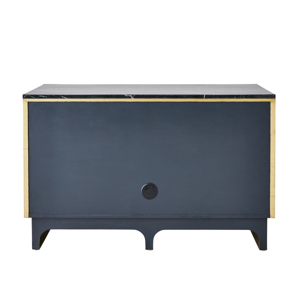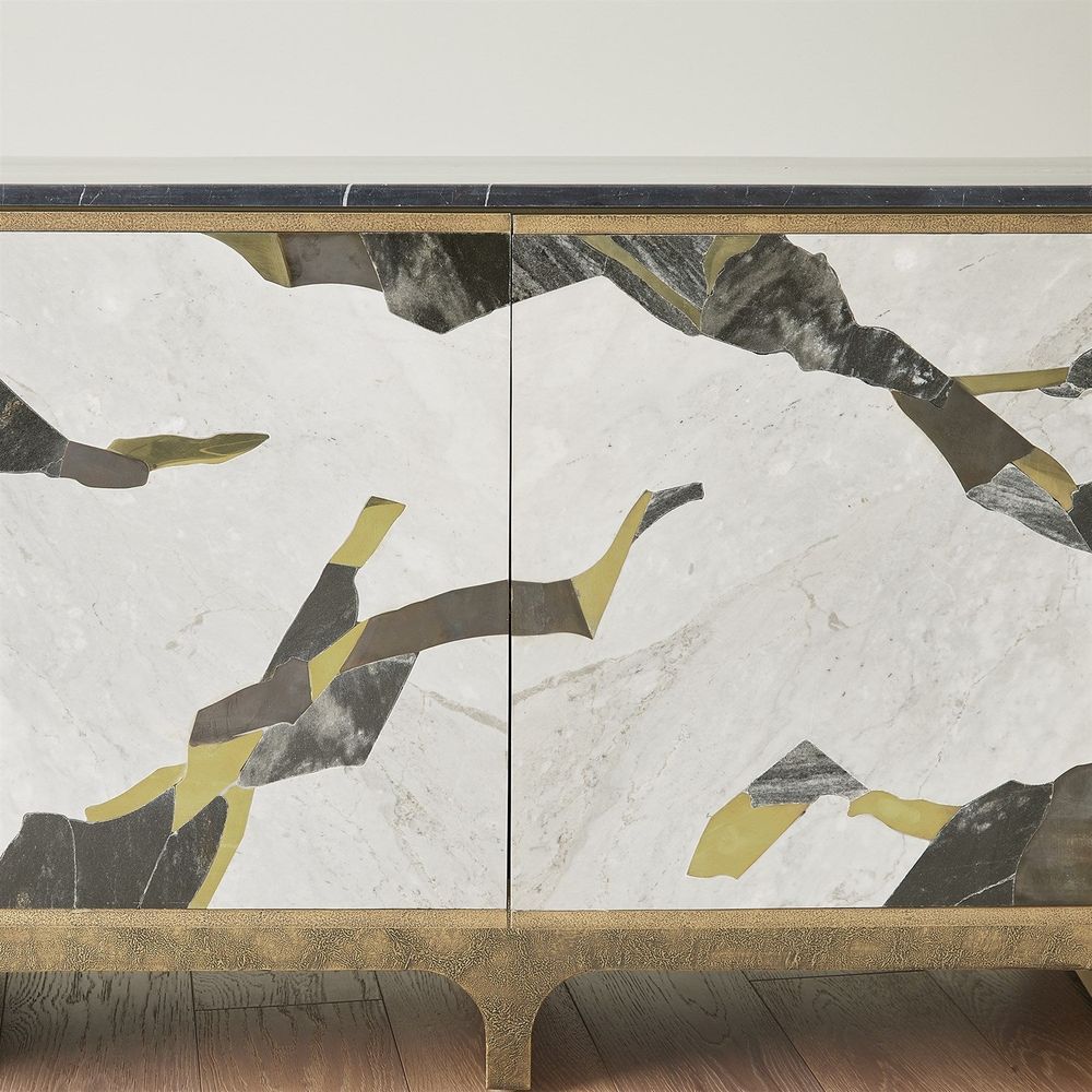 Description: The Inlay Chest showcases a striking design on its front panels, blending Carrara marble, black marble, and polished brass fillets in an artistic and visually captivating pattern. The sleek brass-covered base with an antique brass finish complements the design, while the interior features smooth European hinges and adjustable shelves for both style and practicality. As marble is a natural material, variations in veining and color make each piece unique, adding to its one-of-a-kind character.