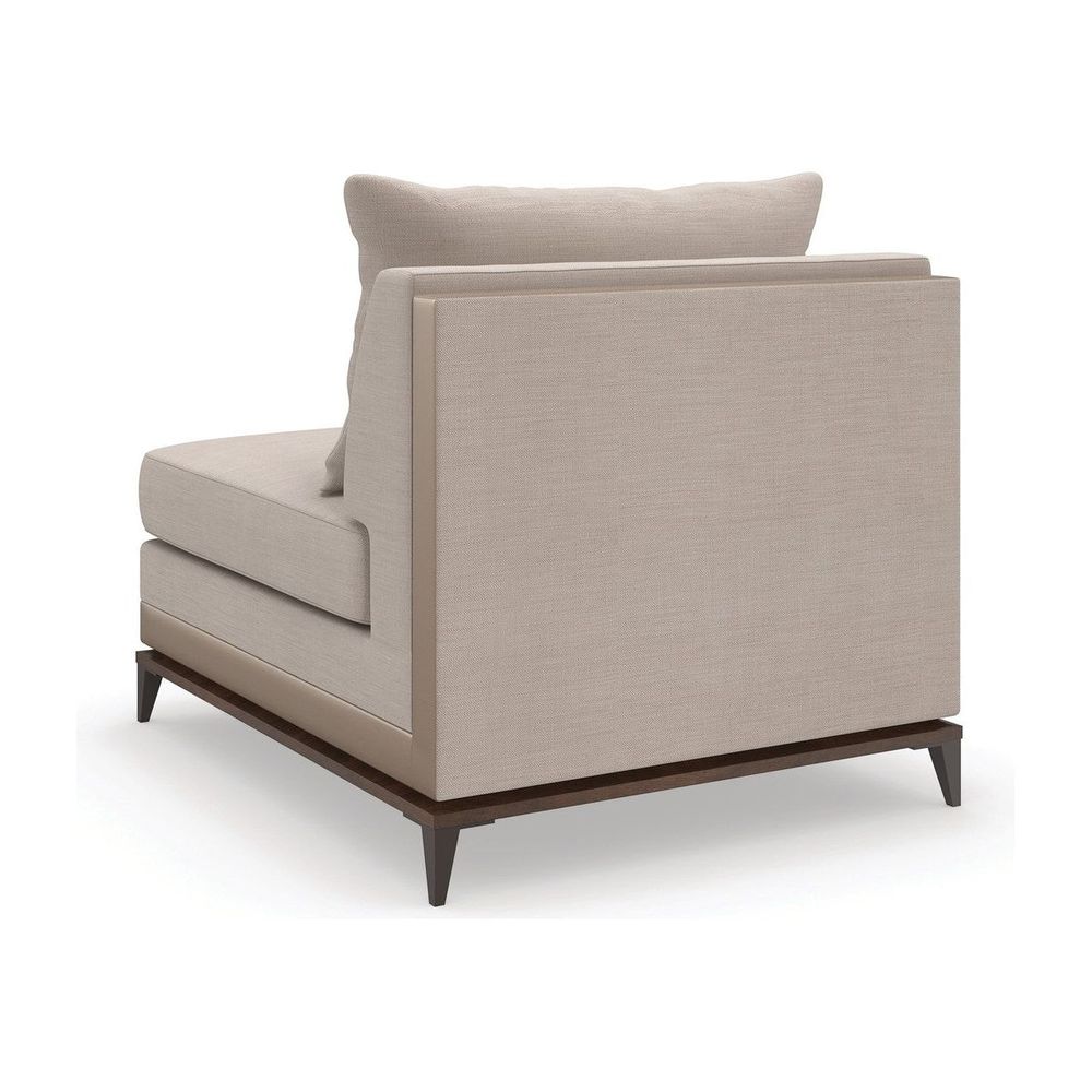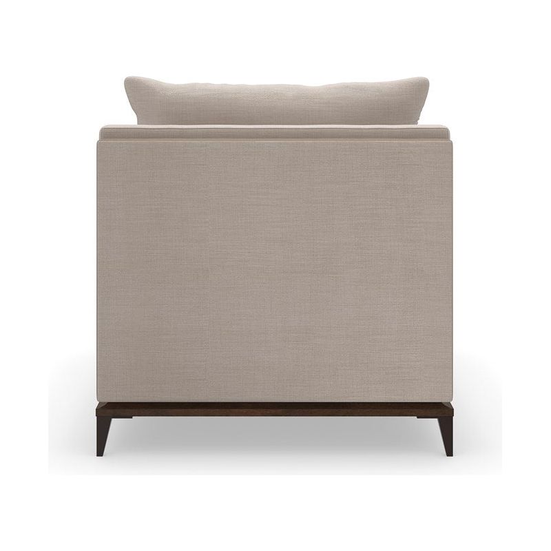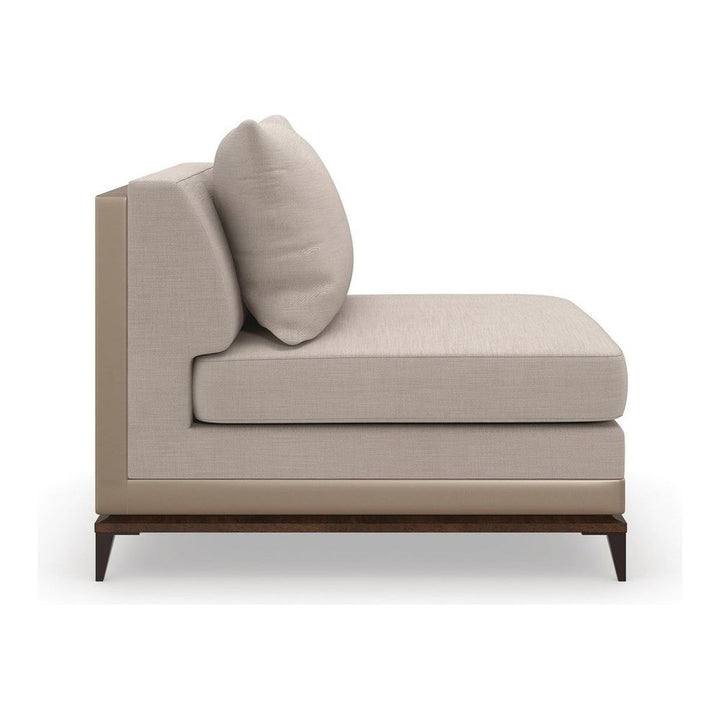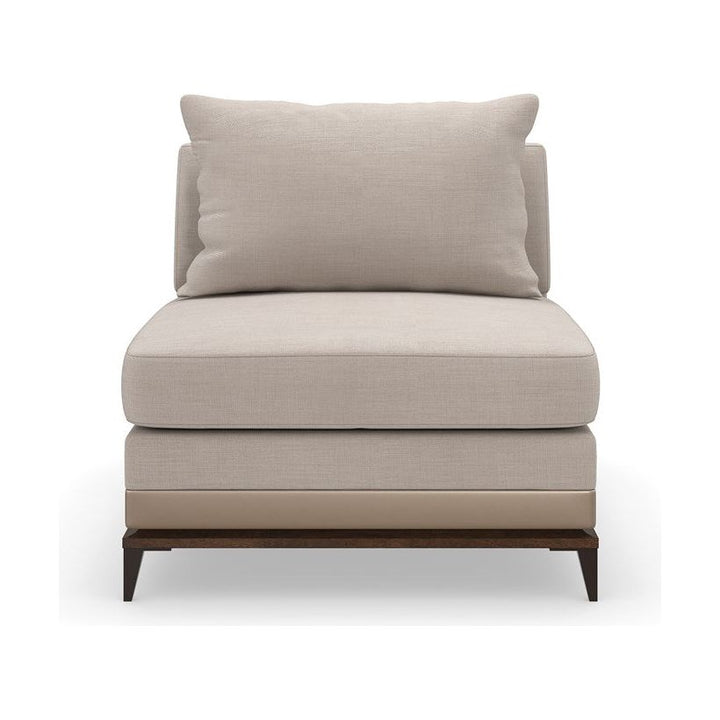 With numerous configurations and options for in-the-moment customization, the Archipelago collection introduces a relaxed sit with a refined aesthetic. Upholstered in a neutral twill fabric with a faux leather accent, and elevated on an exposed Bourbon Glaze wood base with metal legs in a Deep Bronze finish. Style luxe down pillows with a color-blocked expression of saffron velvet, or reverse to display an embroidered, geometric pattern. Collection also includes a right- and left arm-facing loveseat, and matching armchair.