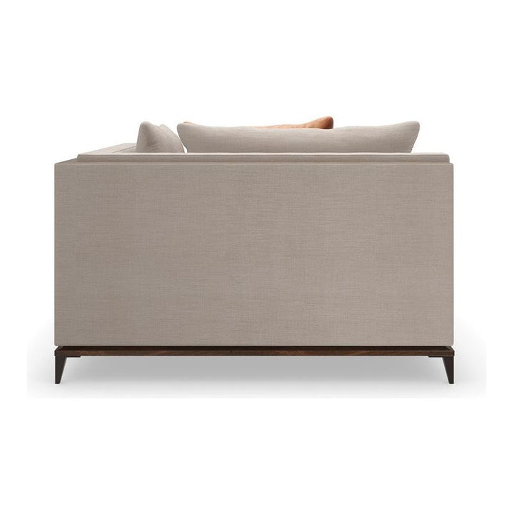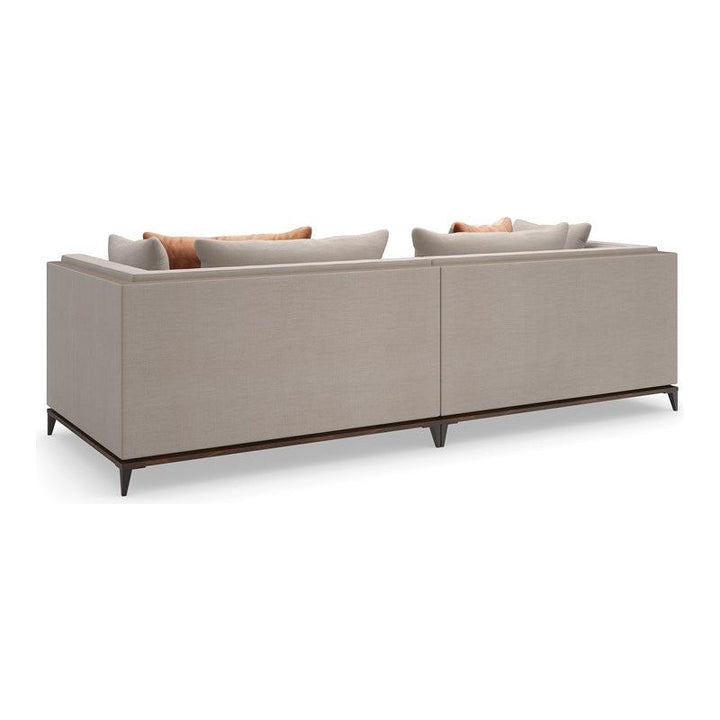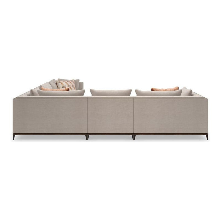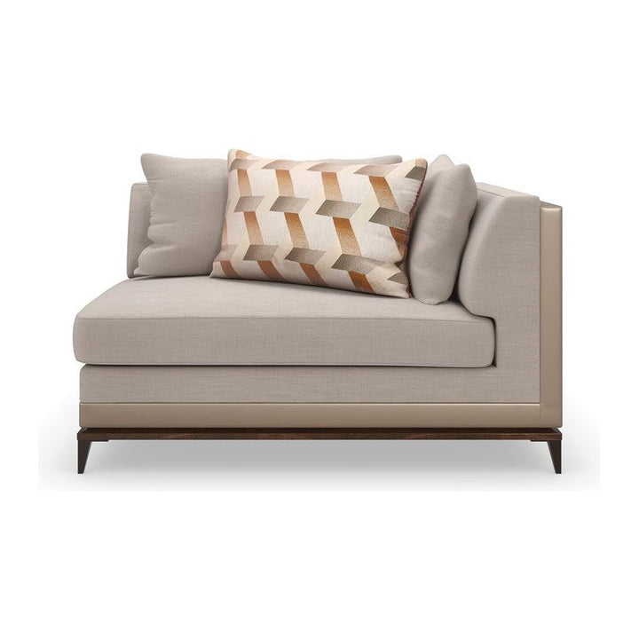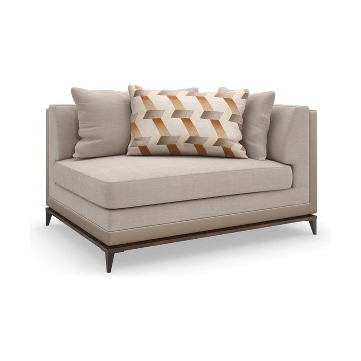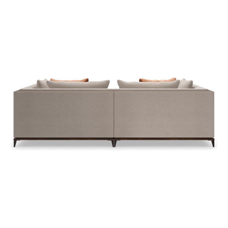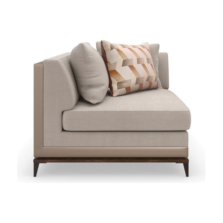 With numerous configurations and options for in-the-moment customization, the Archipelago collection introduces a relaxed sit with a refined aesthetic. Upholstered in a neutral twill fabric with a faux leather accent, and elevated on an exposed Bourbon Glaze wood base with metal legs in a Deep Bronze finish. Style luxe down pillows with a color-blocked expression of saffron velvet, or reverse to display an embroidered, geometric pattern. Collection also includes an armless chair, and matching armchair.