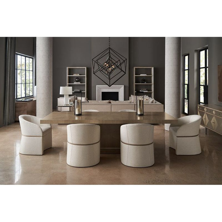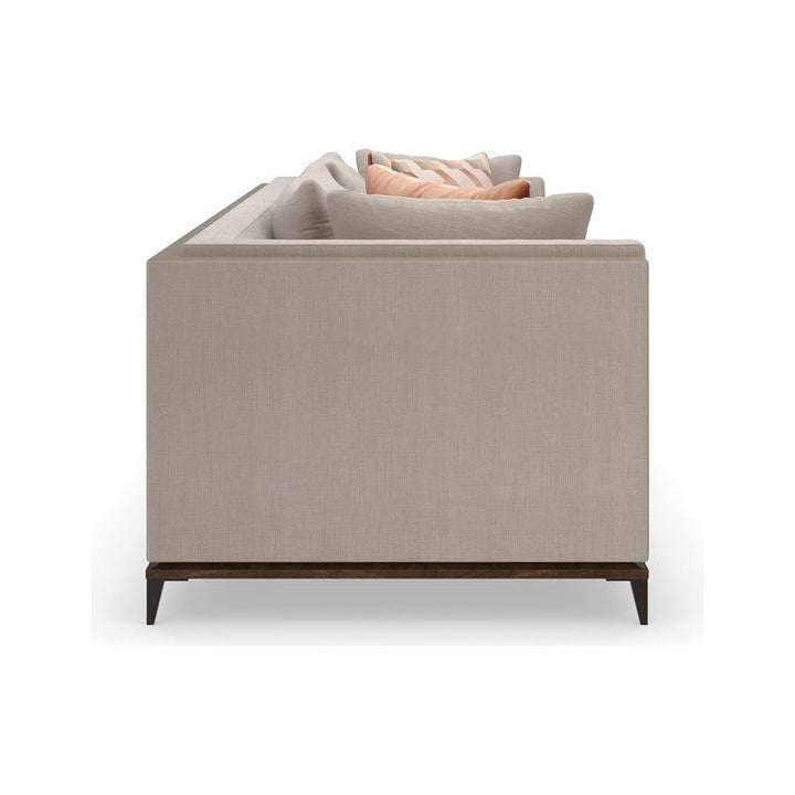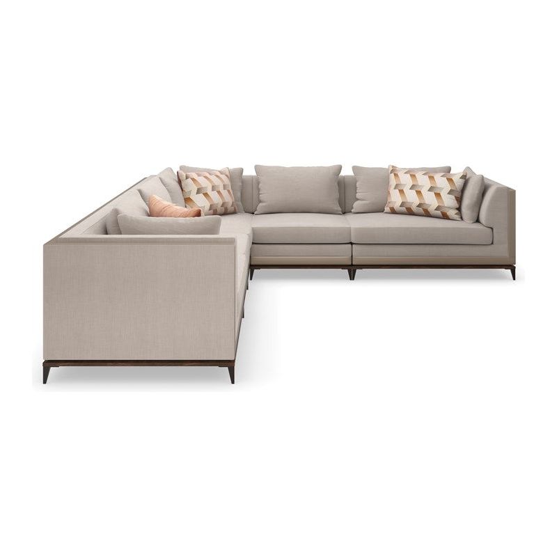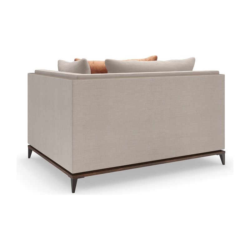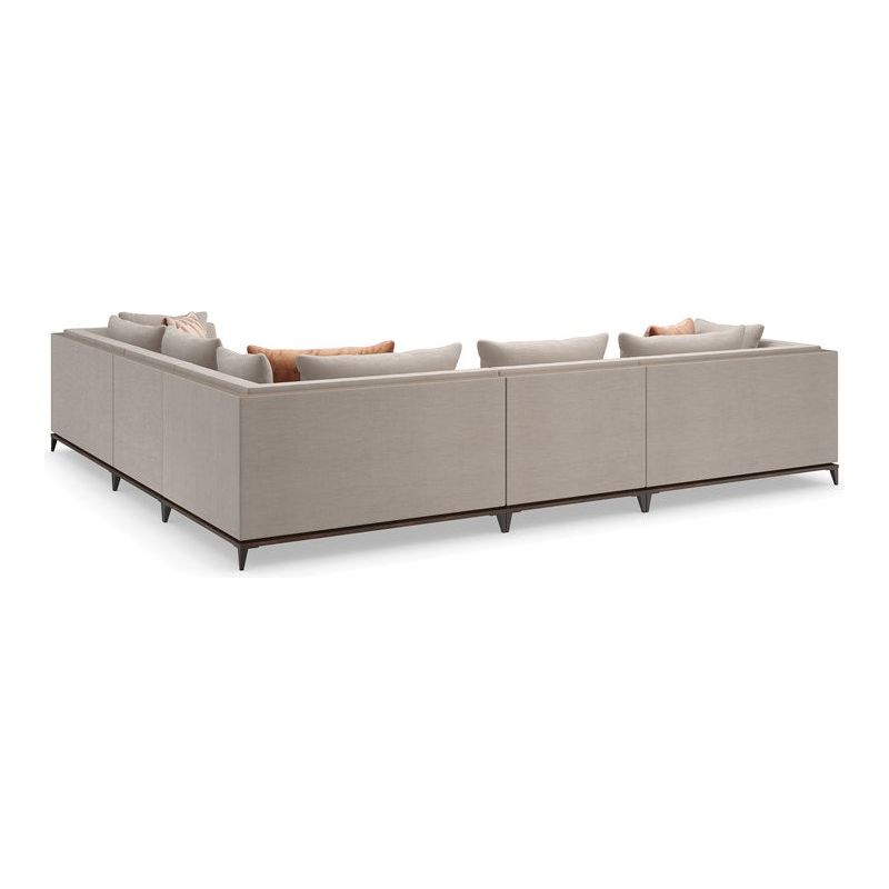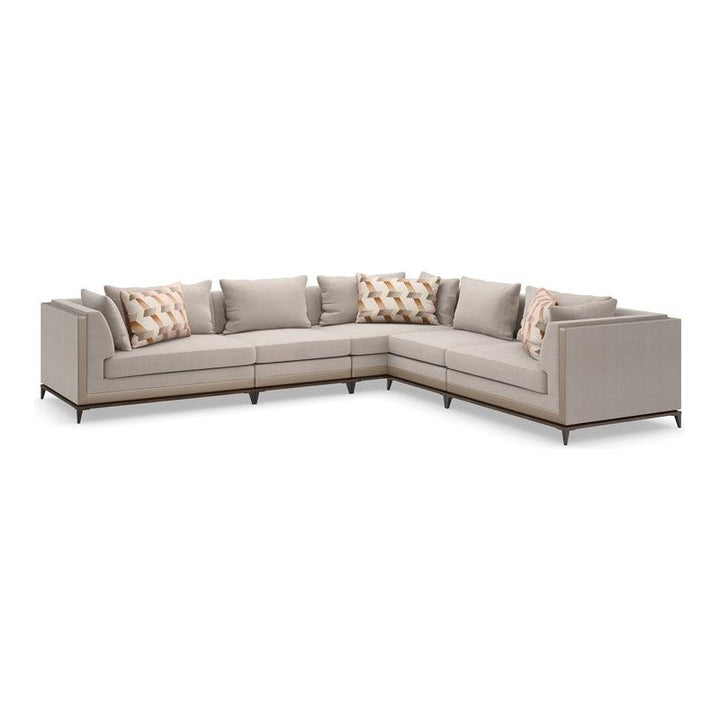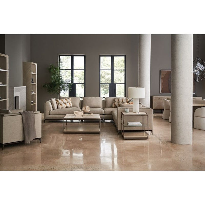 With numerous configurations and options for in-the-moment customization, the Archipelago collection introduces a relaxed sit with a refined aesthetic. Upholstered in a neutral twill fabric with a faux leather accent, and elevated on an exposed Bourbon Glaze wood base with metal legs in a Deep Bronze finish. Style luxe down pillows with a color-blocked expression of saffron velvet, or reverse to display an embroidered, geometric pattern. Collection also includes an armless chair, and matching armchair.