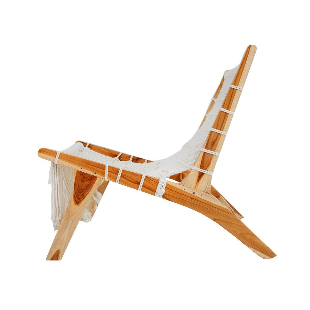 This unique lounge chair is the perfect accent for mid-century and bohemian style spaces. A sturdy teak wood frame features clean mid-century lines and provides support for the draping, woven macrame seat and back.