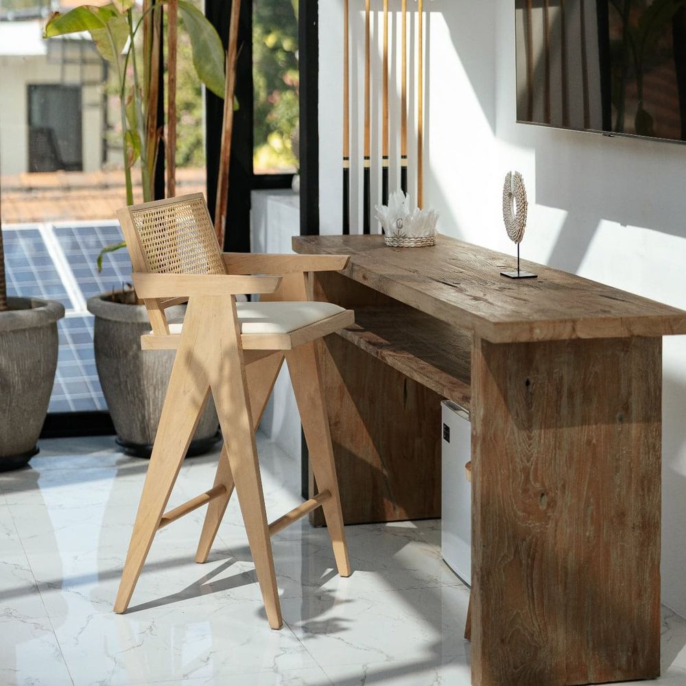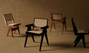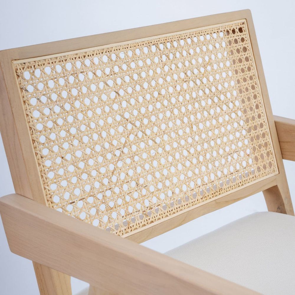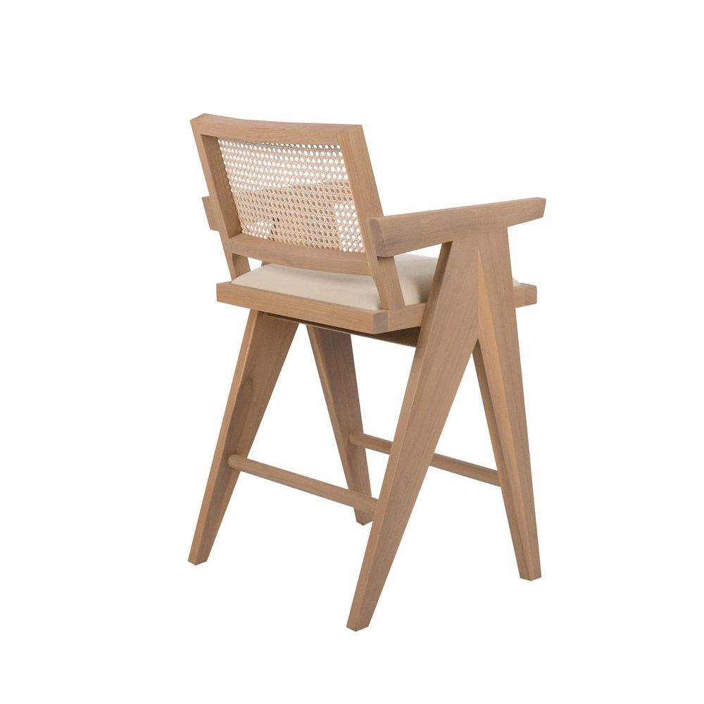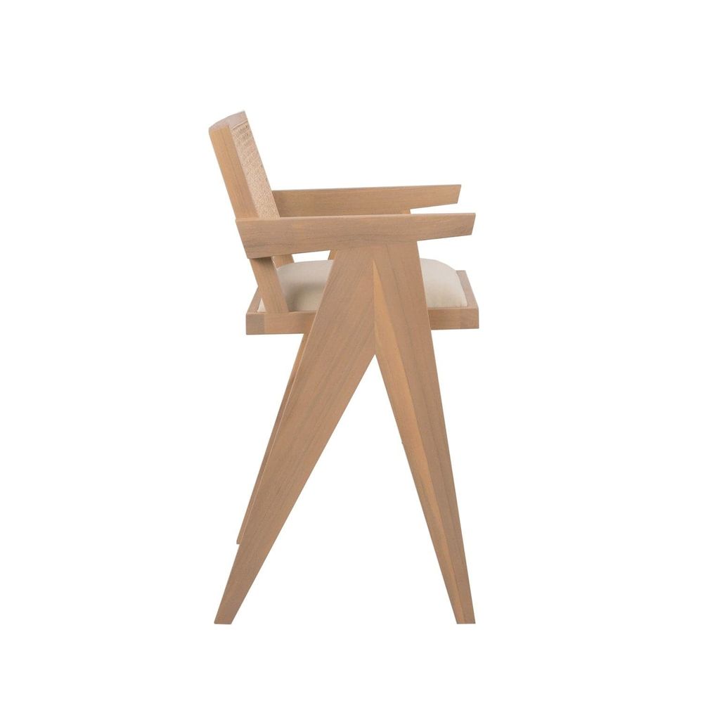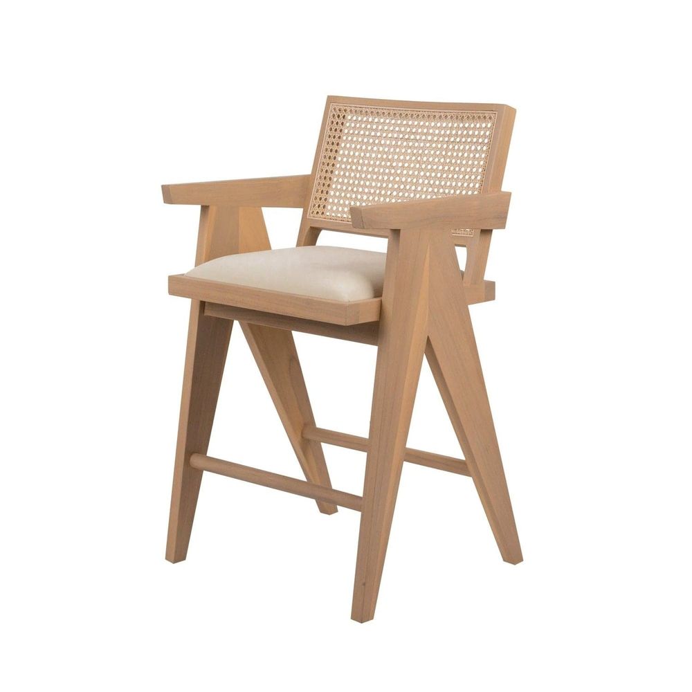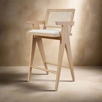 Our Jeanneret Barstool is inspired by Swiss architect Pierre Jeanneret's mid-century modern 1950s design. Like the original, our contemporary reproduction has V-shaped solid wood legs, and a cane seat that provides plenty of comfort. This version has been upgraded for additional comfort with the inclusion of a built in seat cushion.