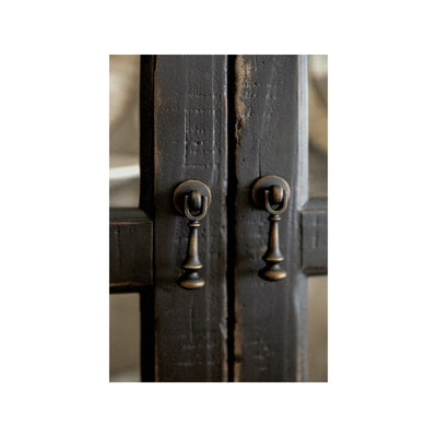 • Finish:Black finish with distressing including worm holes, rasping, multi-layer rub through, and emulsions. Burnished brass hardware.