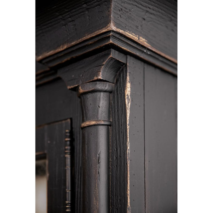 - Finish:Black finish with distressing including worm holes, rasping, multi-layer rub through, and emulsions. Burnished brass hardware.