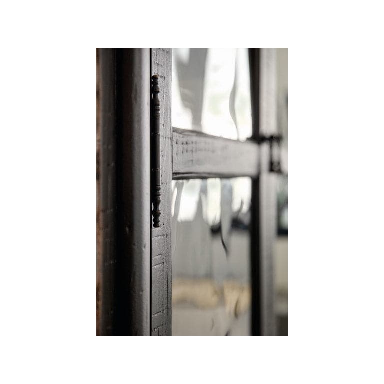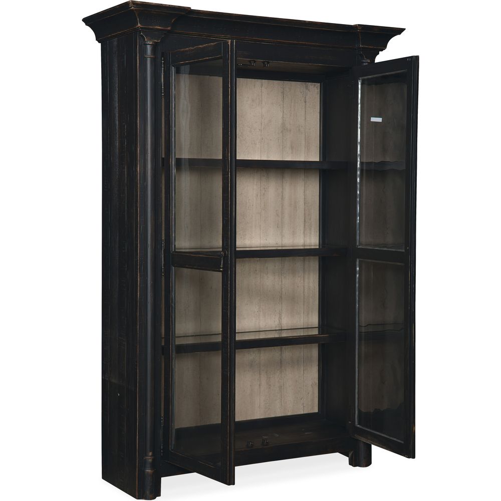 The striking silhouette of the two-door Ciao Bella Display Cabinet with wood-framed beveled glass doors will bring the character of European farmhouses to your home. Crafted of Pine, Poplar and Hardwood Solids with Maple and Pine Veneers, the exquisite black finish looks like it has aged through generations. As practical as it is pretty, the display cabinet has 2 adjustable wood-framed glass shelves and one fixed wood-framed glass shelf. The burnished brass hardware is tear-drop shaped. Inspired by the small farmhouses that dot the French and Italian countryside and have been in the hands of the same family for generations, Hooker Furniture introduces the rustic Ciao Bella Collection. The whole home collection is an eclectic mix of European farmhouse pieces that have the appearance of furniture that has been refinished multiple times as it has passed through the generations. Ciao Bella includes bedroom, dining room, occasional, home office and accent furniture, and features a finish called Timeworn Gray that accentuates the historical nature of European farmhouses - many of which include a variety of furniture styles that have been added by each generation of owners.