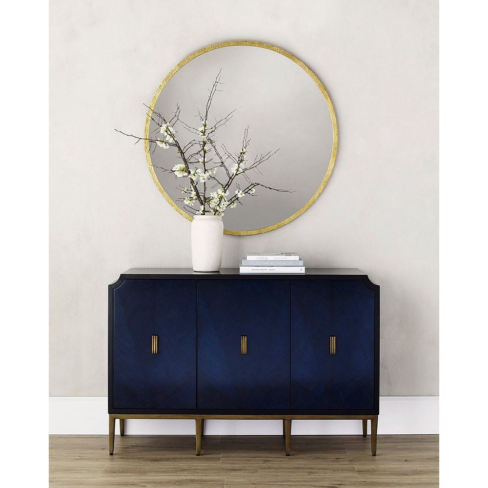 Description: The Kallista Blue Cabinet has a dark sapphire blue finish that enlivens the sycamore veneers on its door fronts. The wood grains bring the cabinet a hint of distressing that contrasts the sleek lines of the base and door pulls in an antique brass finish. The exterior is finished in a glossy caviar black. Design details on this navy blue cabinet include soft-close door hinges, and adjustable shelves and glides.