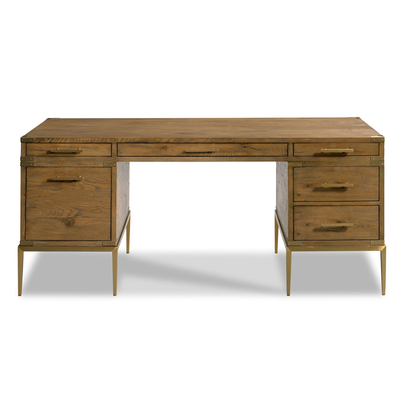A wonderfully functional desk adapted from Japanese originals from the late 17th century. Our modernized design has authentic corner brackets called Herikanagu and a rectangular oak top over a variety of file and storage drawers mounted with brass bar pulls elevated on a metal base.