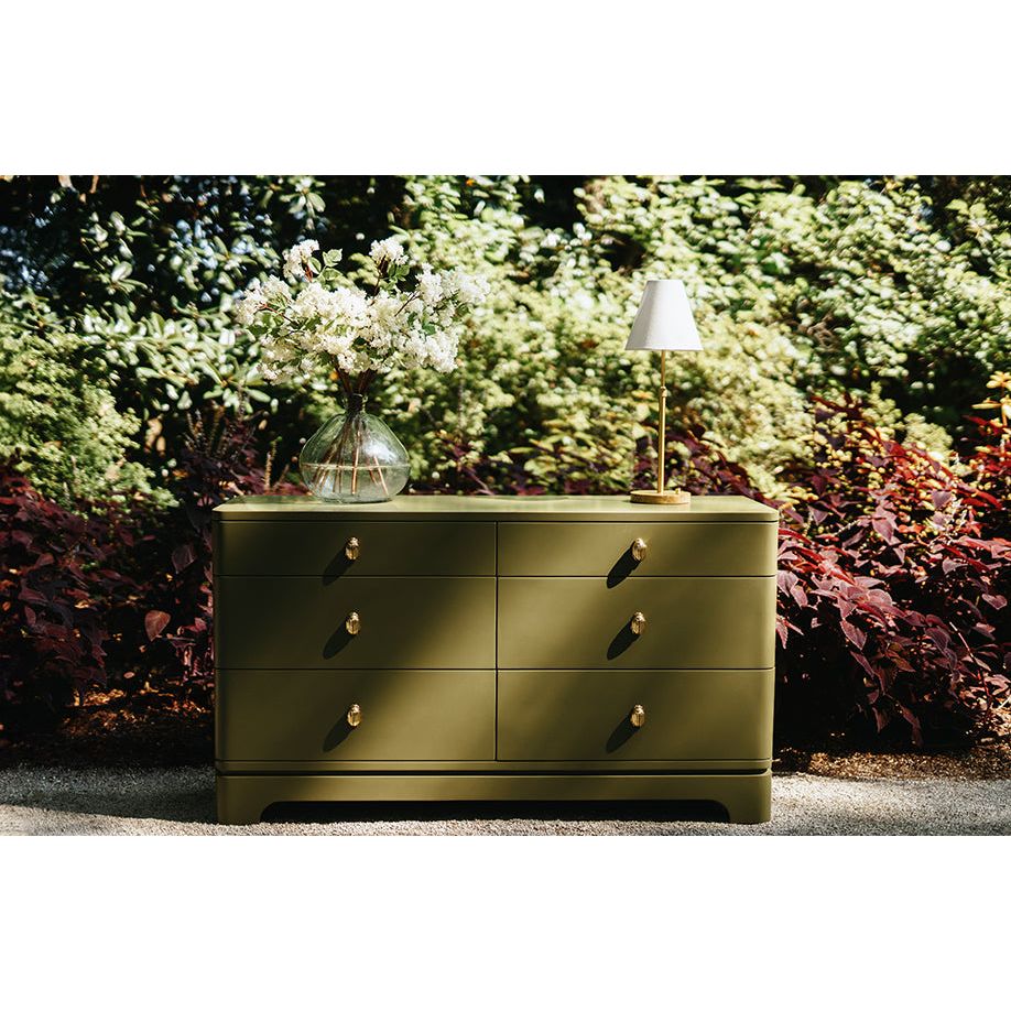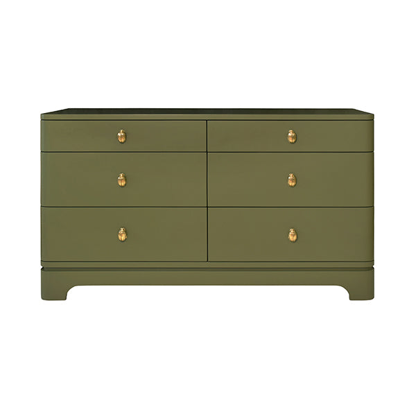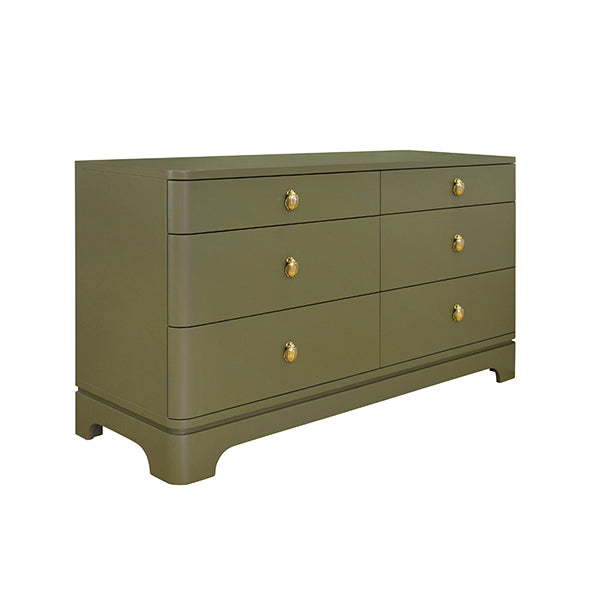 Description: SIX DRAWER ROUNDED EDGE CHEST WITH BRASS BEETLE KNOB IN OLIVE GREEN MATTE LACQUER