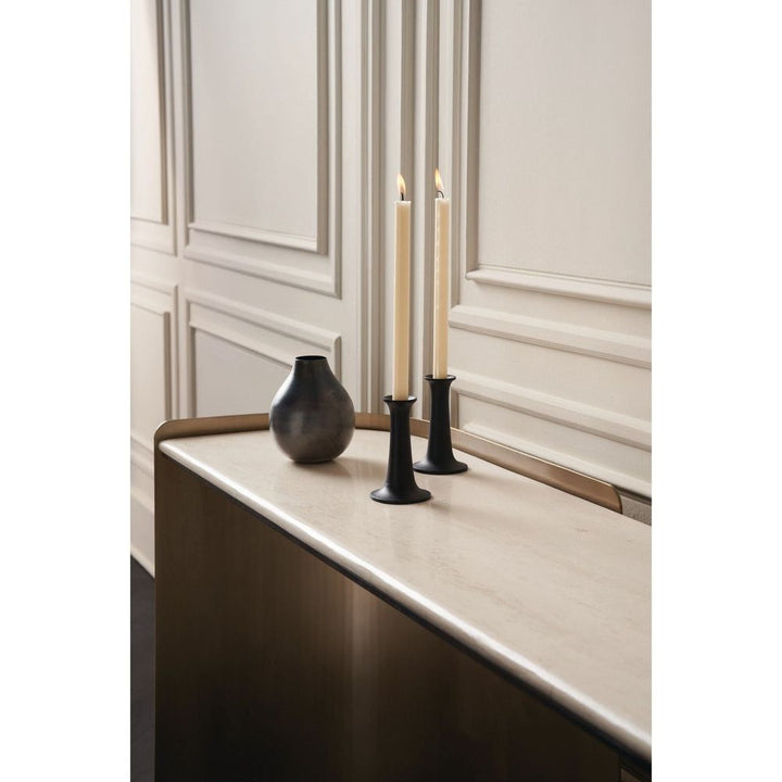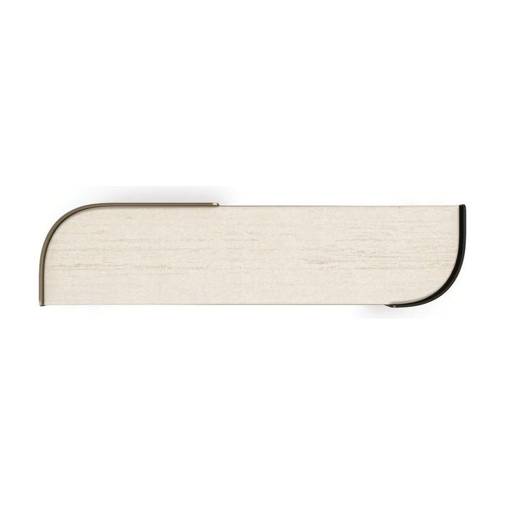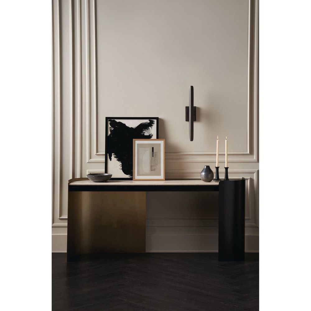 With an inherent rhythm and sleek design, the Movement console is fluid in both form and function. Artfully integrating sensual curves with muted lines, a Creme Travertine stone top is balanced on metal legs in contrasting bronze finishes for added drama. Makes an alluring statement in halls, entryways, and home offices as a minimalist desk.