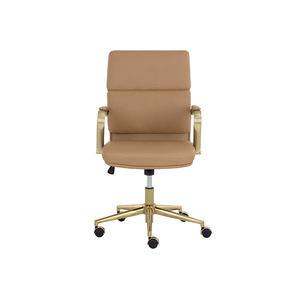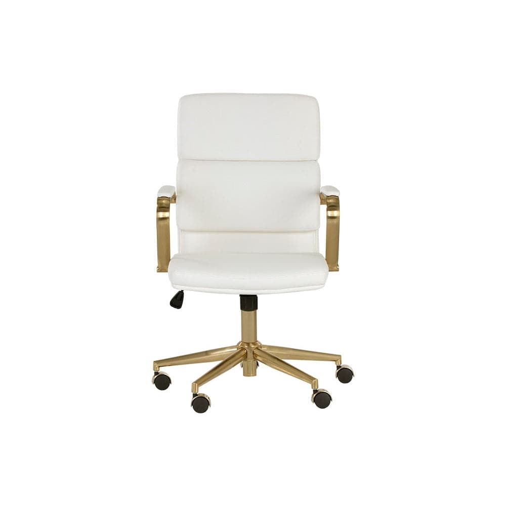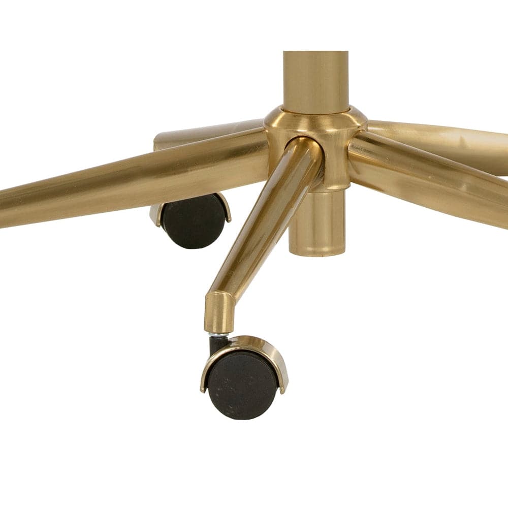Create a stylish and functional workspace with this stunning modern office chair. Stocked in snow, onyx and tan faux leathers, and features generously padded seating for optimal comfort. Completed with castors for added mobility, and a gold stainless steel frame. Handle With Care: This design has been crafted with faux leather. Faux leather is manufactured to reflect the natural characteristics of leather; as such, colour variations, markings wrinkles, grooves, and light scratches are appreciated characteristics. No two pieces will be alike. Visit our Product Care page for more information on how to ensure the lasting beauty of this piece.
